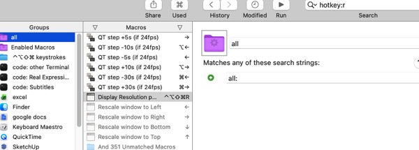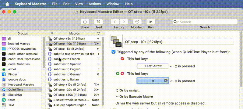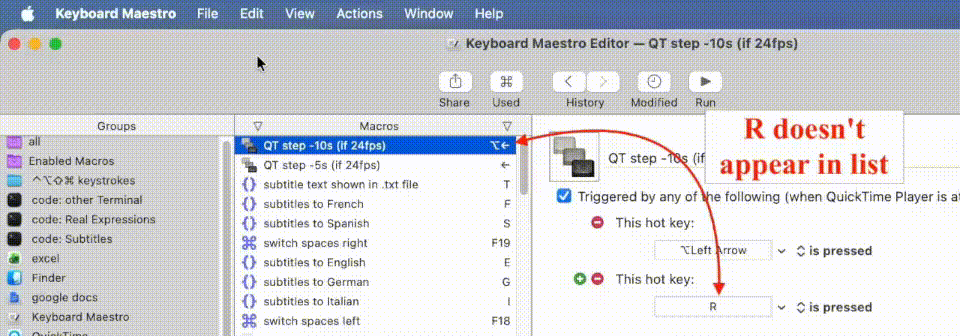 Regarding what you wrote here, I made a video to show you what I see when trying either hotkey:r or hotkey:R to find the problem macro. That macro is called: “QT step -10s (if 24fps)” and has the primary hotkey ⌥← and secondary hotkey r