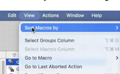 In the list of macro groups click on the “All Macros” smart group. That will result in all your macros being listed. Now click the downward pointing arrow at the top right of the macros list; as a result your macros will then be ordered by hot key.
