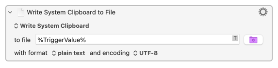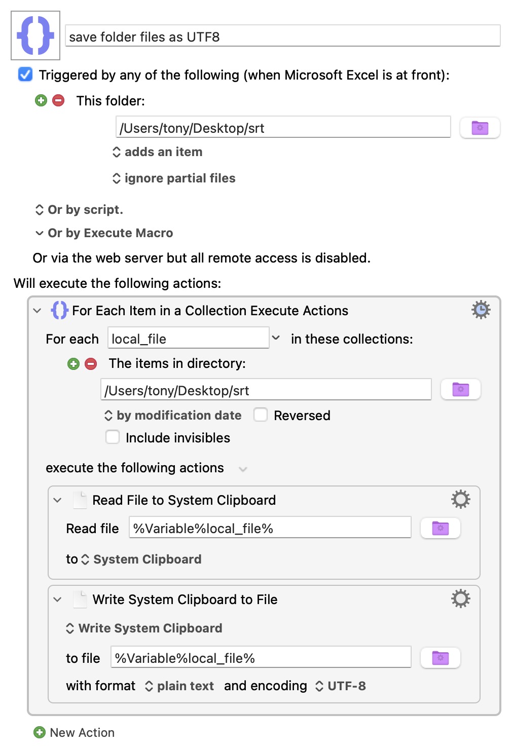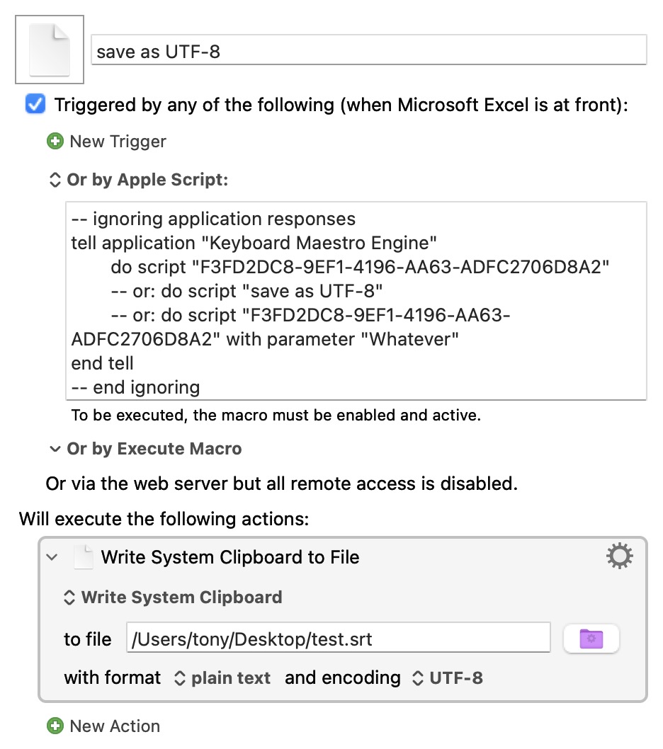 I want to save a column of an Excel spreadsheet as a UTF-8 text file using VBA, but have found no way to do it. By contrast, saving as UTF-8 is easy with Keyboard Maestro’s Write System Clipboard to File action.