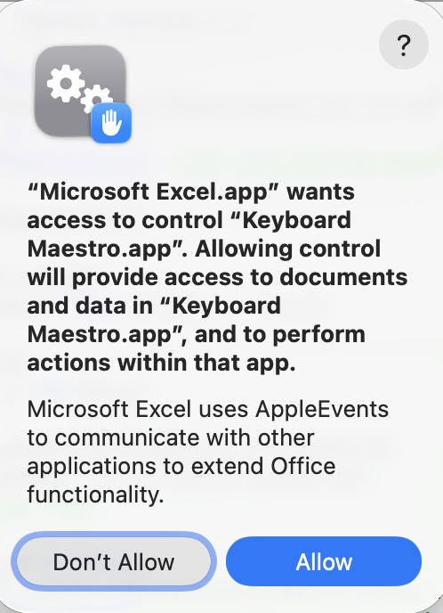 But now I can’t figure out how to trigger that Keyboard Maestro macro from Excel VBA. I tried getting Excel VBA to send a keyboard trigger using some code involving MacScript, but it didn’t work and then I found out that was deprecated. I also found something called kmtrigger but it looked complicated.