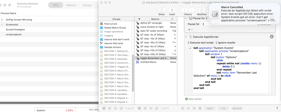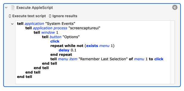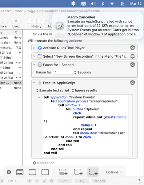 @Nige_S When I tried the following macro including your script it did not click the Options button and gave the error shown – but then, maybe I need to include some other actions? The actions above it have worked in other macros and you can see at the bottom that it is bringing up the right menu