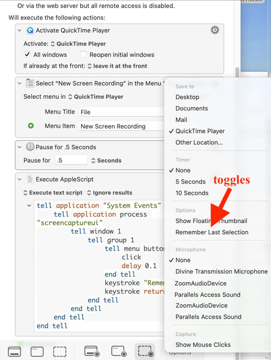 I want to use a Push Button Action to access the buttons that appear when preparing for a QuickTime screen recording (⇧⌘5). In the screenshot below I show these buttons, along with the pop-up menu for the “Options” button; my goal is to be able to toggle the “Remember Last Selection” submenu item shown by the red arrow.