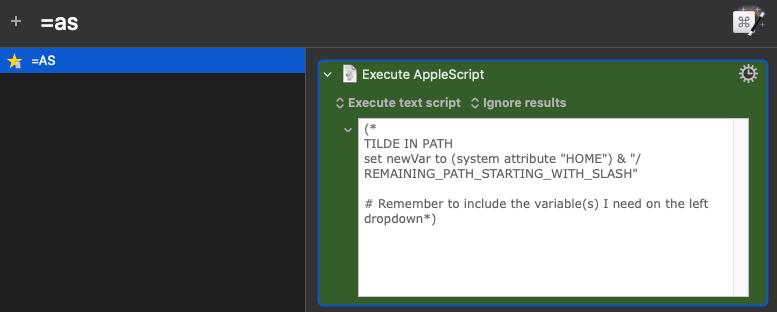 Still related to the favorites, add "codes" for certain actions/groups of actions, instead of setting names that are "exact" and "pretty". For example all my favorites start with = so when I type = all my custom actions are visible. For my Execute AppleScript, the name I gave it is =as (as for "AppleScript")