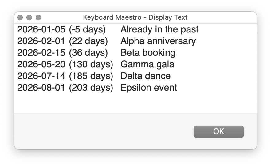 Longer term, I’d like to set this up for a series of 5-8 events in a calendar year. I’d like to be able to supply (by Action asking for input, or a series of lines, or a table) event names and dates, and have the macro paste the weeks and days for each event that has not yet occurred.