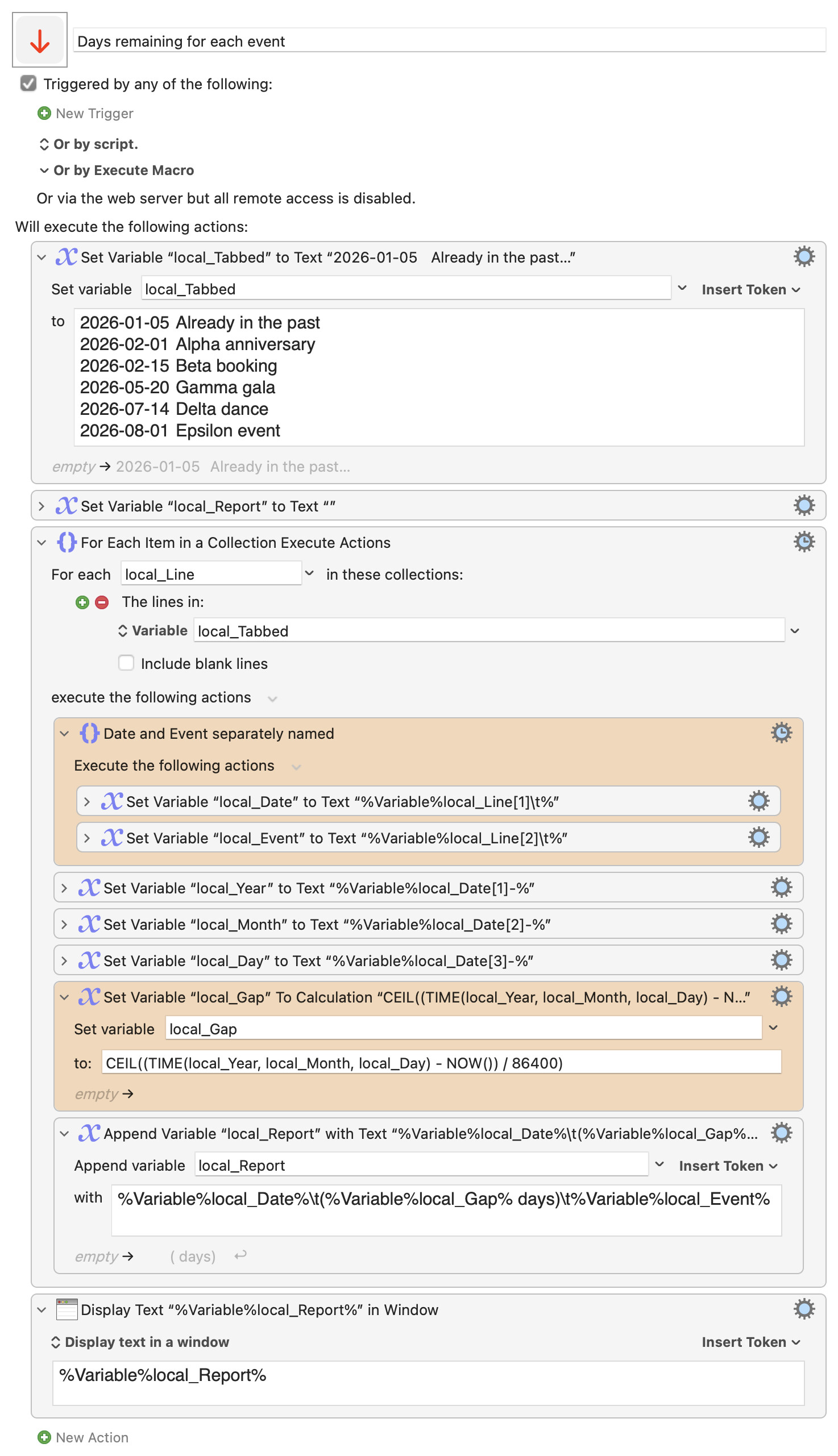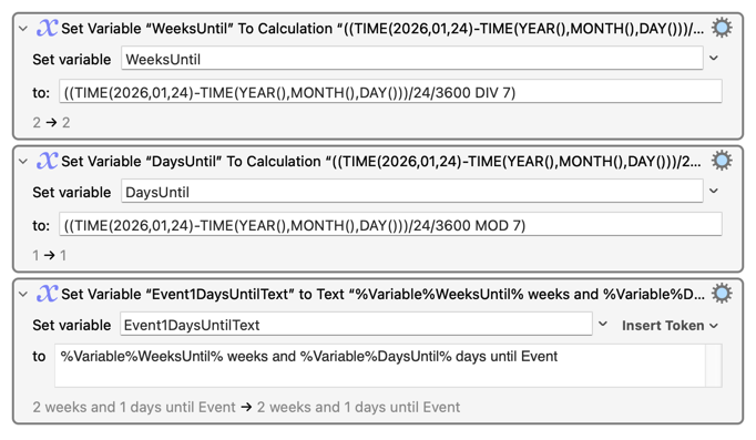 I would now like to expand it to several events. Is there any way to input to the TIME() function a variable? My immediate goal is to have this work for two events. I have created Variables for the name of each event. I changed the third Action above, replacing “Event” with the event-name variable. Then I grouped the Actions and duplicated the group for Event2. The final Action concatenates some additional text and pastes: