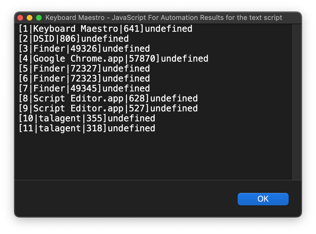 When I run CJK's script in KBM I get nothing. When I run CJK's script in Script Editor, I get "undefined" for everything except the Script Editor window itself. For that I get