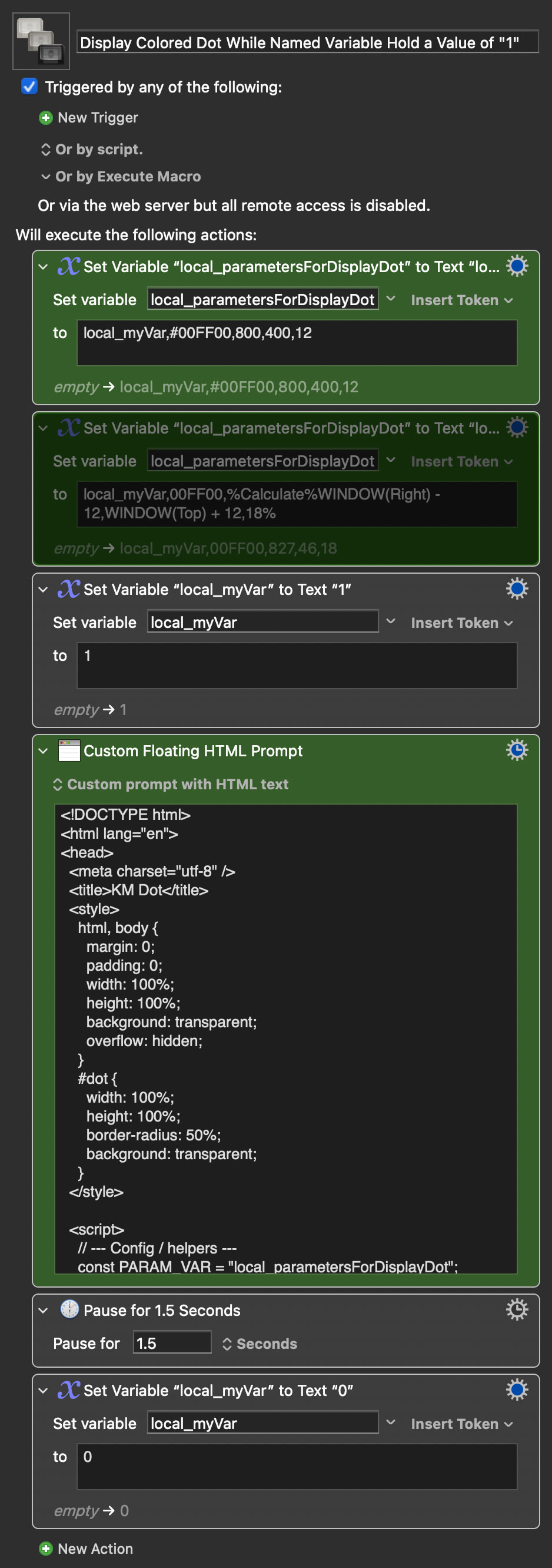 The script runs asynchronously (so that the rest of the macro can continue while the script runs in the background). If a named variable starts with a "1", it will display a dot with set color, position, and diameter, and it will display this dot until this variable does not start with a "1" (so basically while the variable starts with a "1").