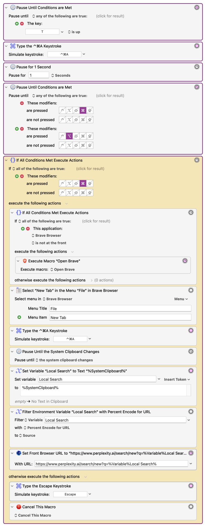 I ended up coming with this solution. The macro starts a dictation with Wispr Flow, then opens a Perplexity search with the dictation, but cancels if the user presses opt.