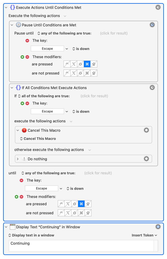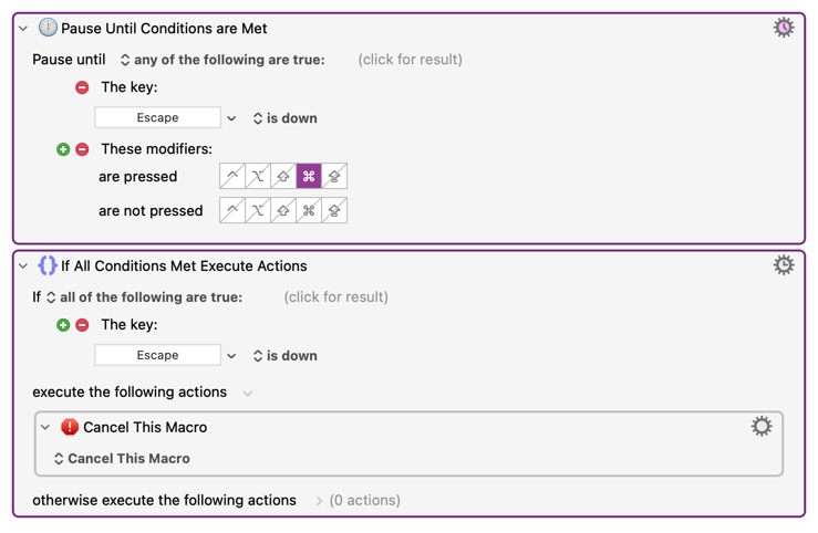 However, with the two actions below, if the user presses esc, the macro sometimes runs too quickly (i.e. esc is already up) for the "if" to register that esc was pressed, and the macro continues to run.