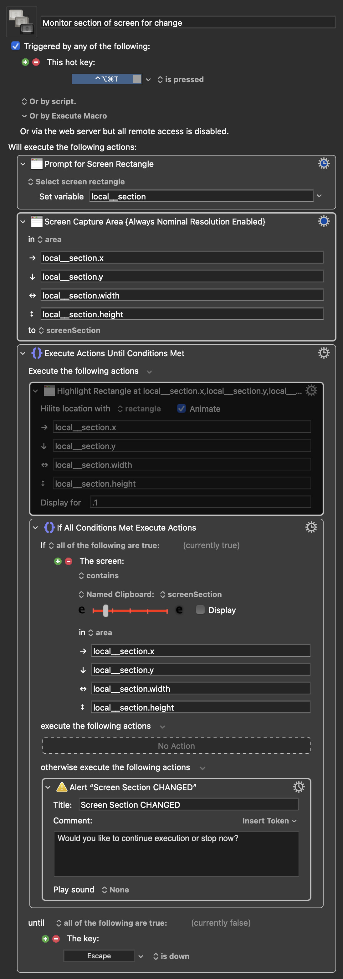 This macro prompts you for a screen rectangle selection, stores a screen capture of this area in a Named Clipboard, and then continuously monitors this area to see if the state of this area is the same as when the screen capture was created.
