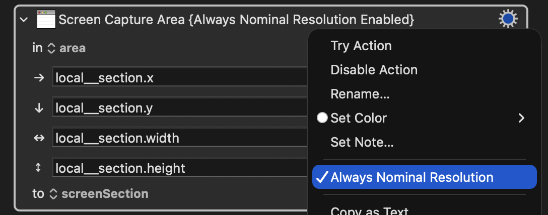 Importantly, when making a screen capture for use like this in a Found Image condition, you need to enable the setting "Always Nominal Resolution" in the gear menu of the Screen Capture action: