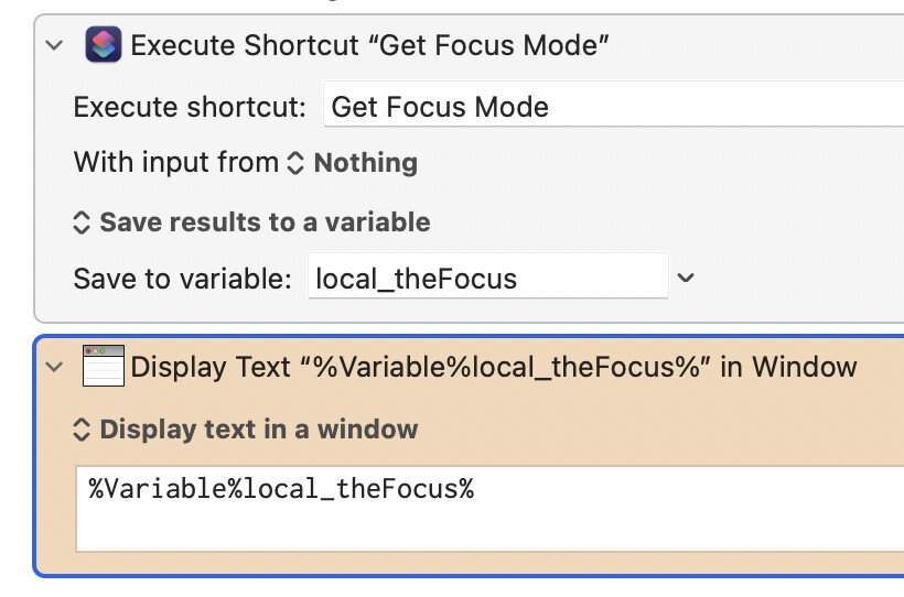 There's also a script that can fetch the current Focus Mode (took it from Automators Discourse) and I've set it to save the focus mode to a variable whenever I wake my laptop. However it will not update manually if I happen to change the Focus Mode after I wake my computer.