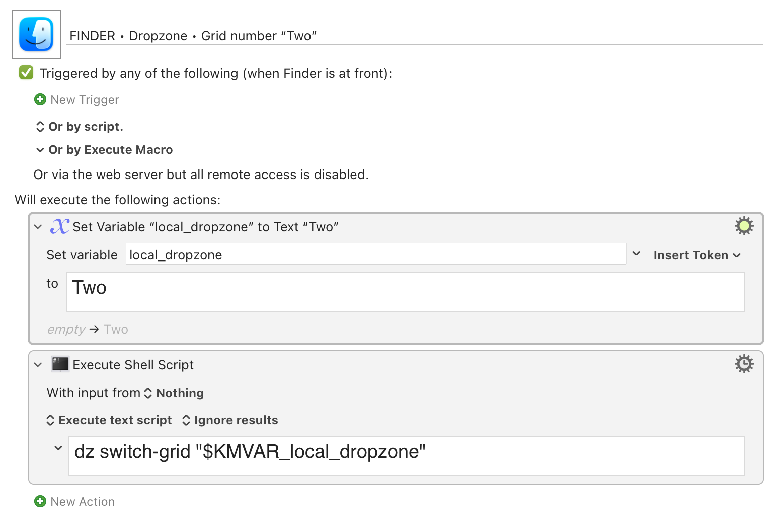 How to Write a KM Macro to use this Terminal Command “dz switch-grid NAME” ? I then plan to invoke this macro from the Finder, as a trigger or access to the menu, BEFORE dragging and dropping my selection.