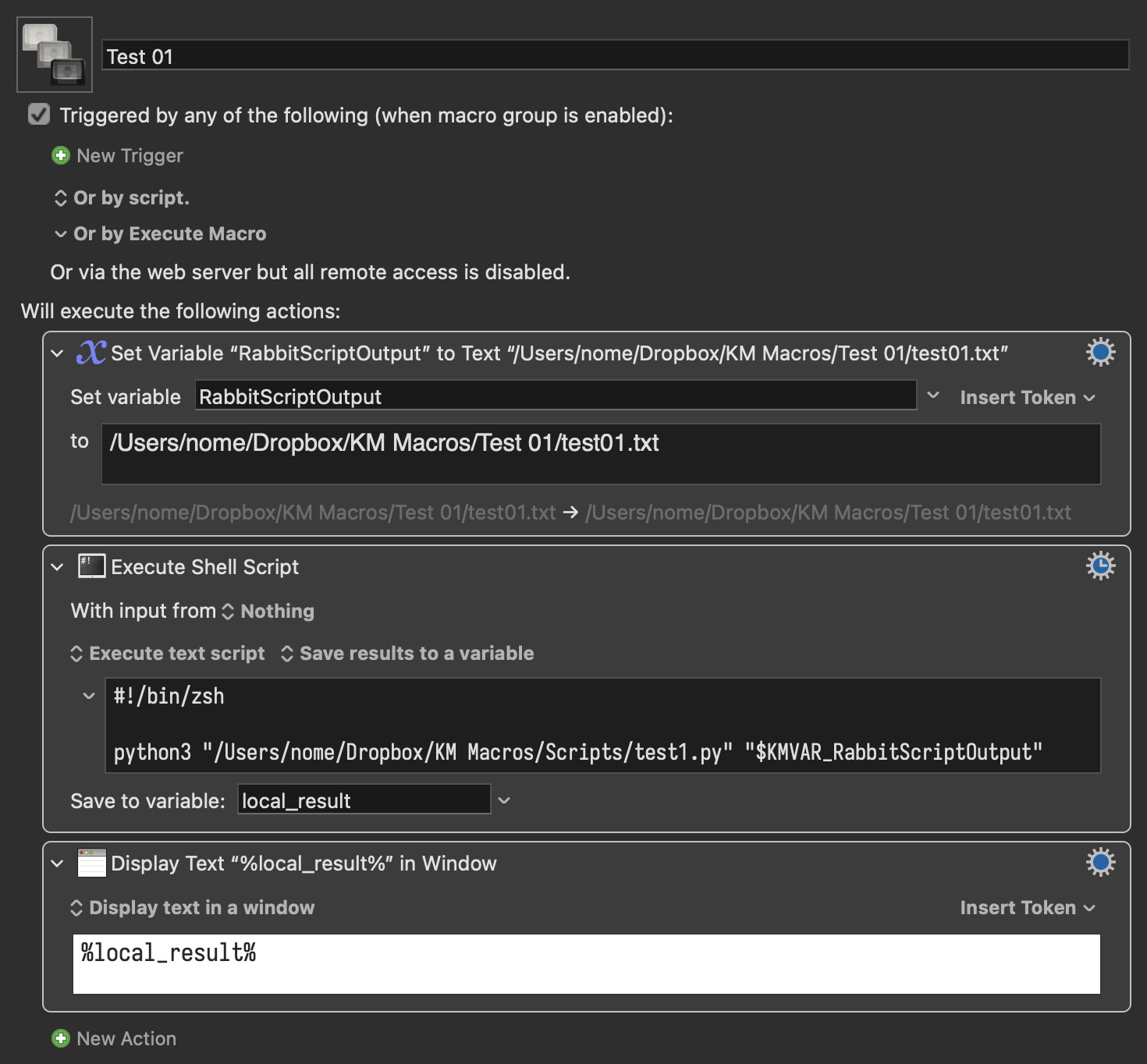 I am still doing a lot using KM and Python/Apple script but now I am trying to execute a Python-script from an action in KM. But it doesn't execute. And now - myself and Mr chatGPT have spent 10 hours trying to make it work (yes:chatGPT has disappointed me massive on this).