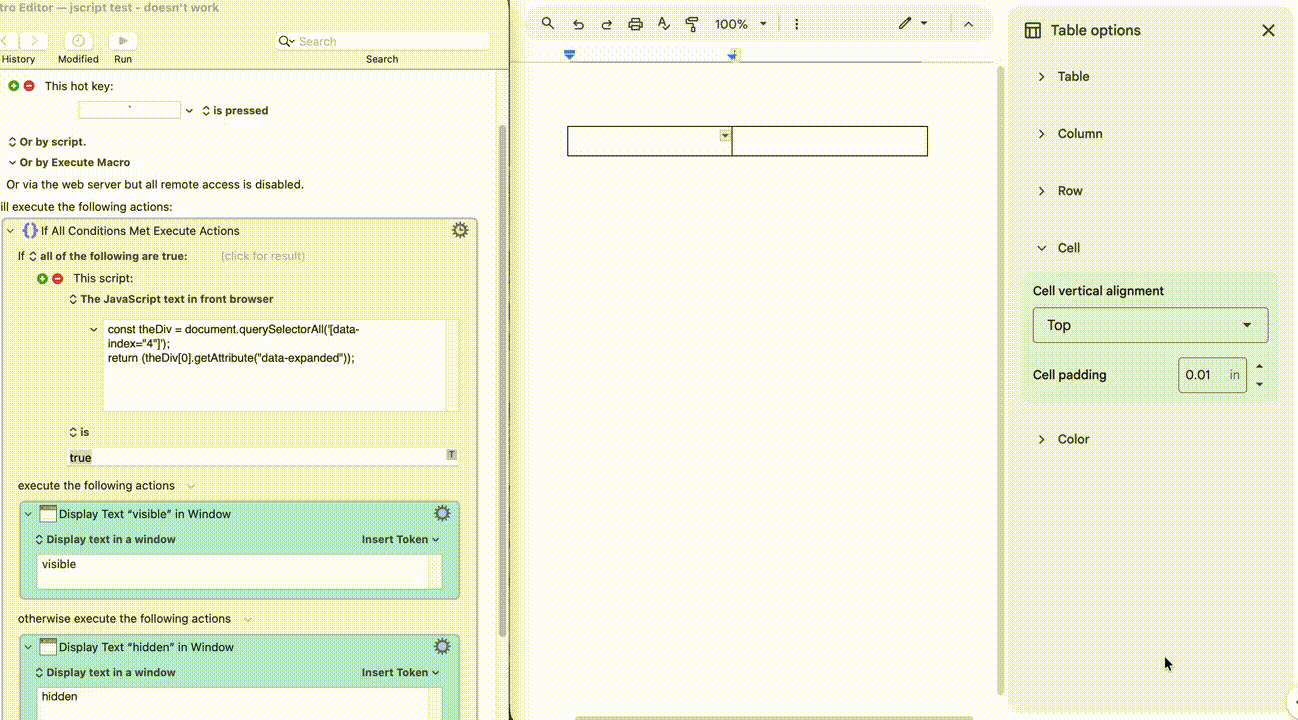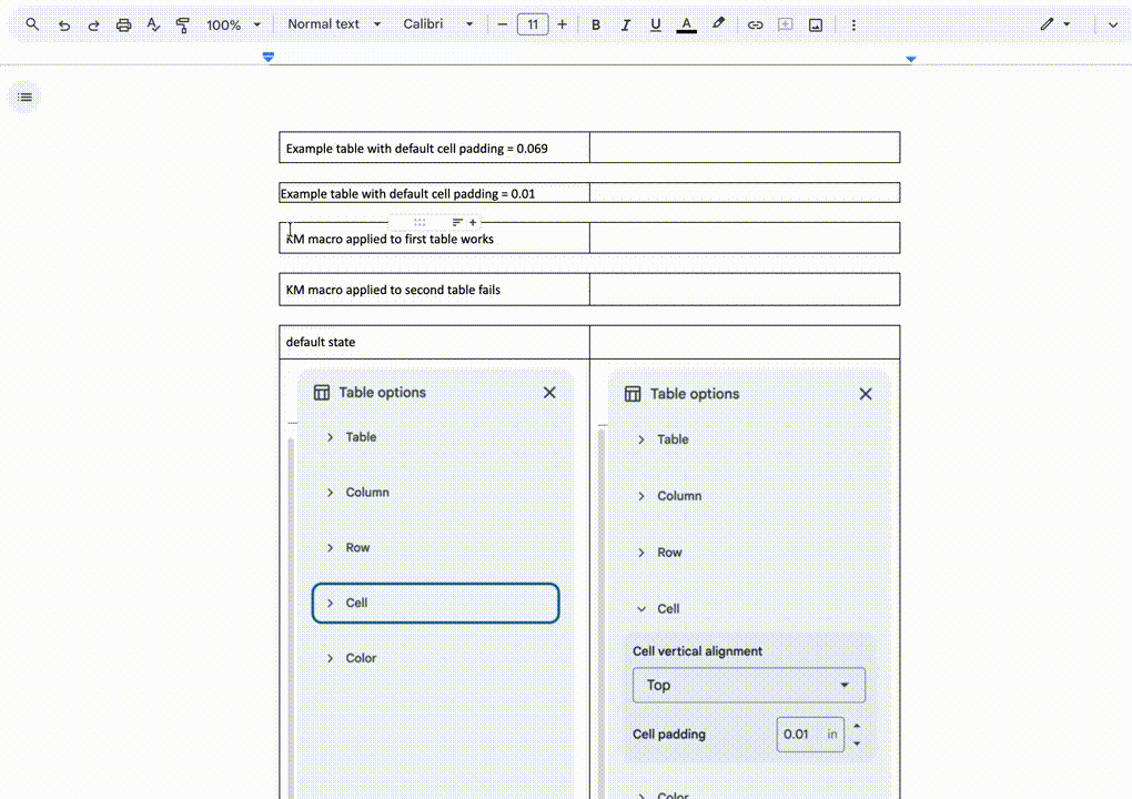 This screen recording below shows a KM macro changing the cell padding in a google doc. The problem is that it only works the first time. It fails the 2nd time because the Table options dialog does not reset after each use. I have searched but can find no way to reset the state of Table options. I’ve found this situation for other KM macros too: I struggle to get it working only to find it fails after one use because I can’t reset a dialog state.