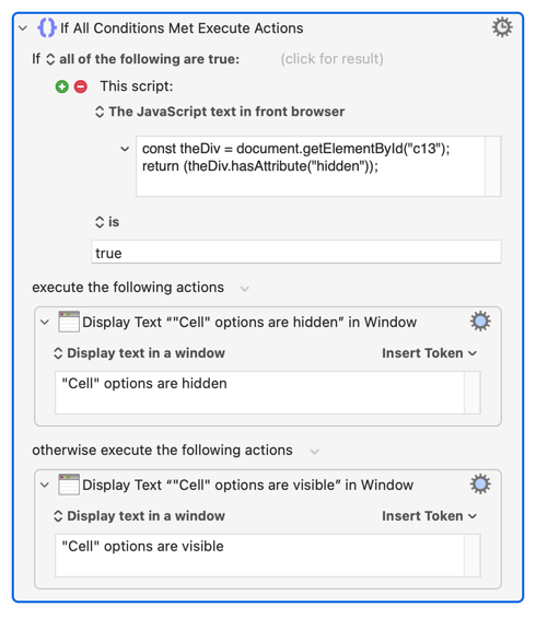 I tried your javascript action but it always returned ‘"Cell" options are visible’ regardless of whether it was collapsed or not. I’m guessing this means the ‘document.getElementByld("c13")’ part isn’t working, and when I tried searching the page for ‘c13’ I couldn’t find it.