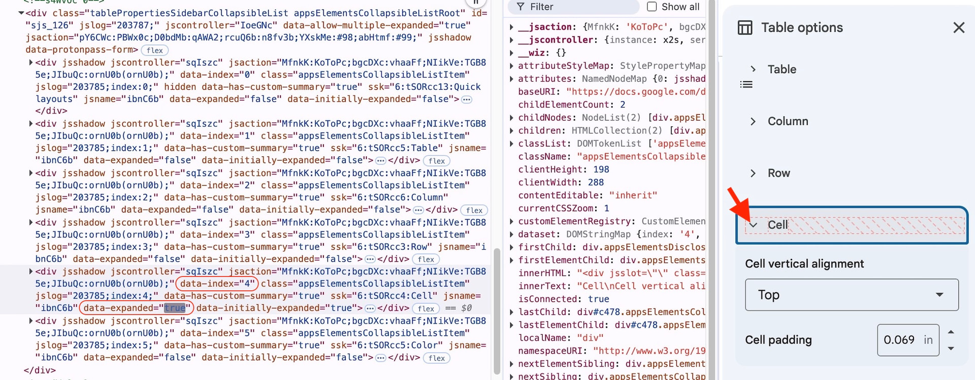 Then I tried inspecting the page while clicking to expand the “Cell” button and saw that it’s associated with “data-index 4” (ie, the 4th button) and has a “data-expanded” property that changes from false to true. But I don’t know enough javascript to know how to grab that info.