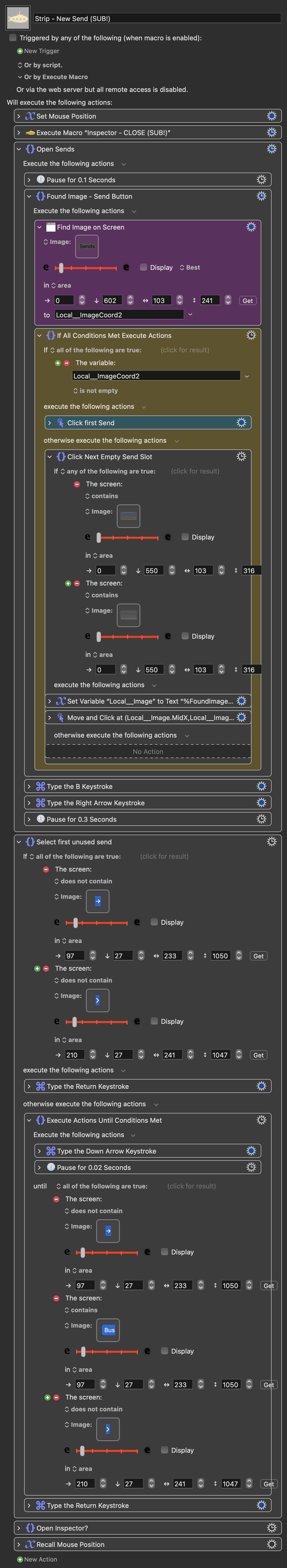 Hi, I've replaced the image in the 'send submacro' with my own (and also the 'setting' image in the 'load setting section of the main send macro "Strip search - send") and this works on a track with no sends assigned to it. It adds a send on bus 1 and the aux I've asked for. But if I try to add another send to the same track, nothing now happens.