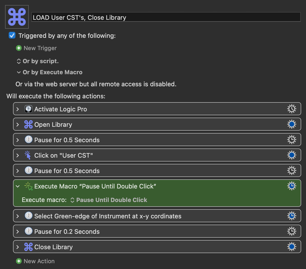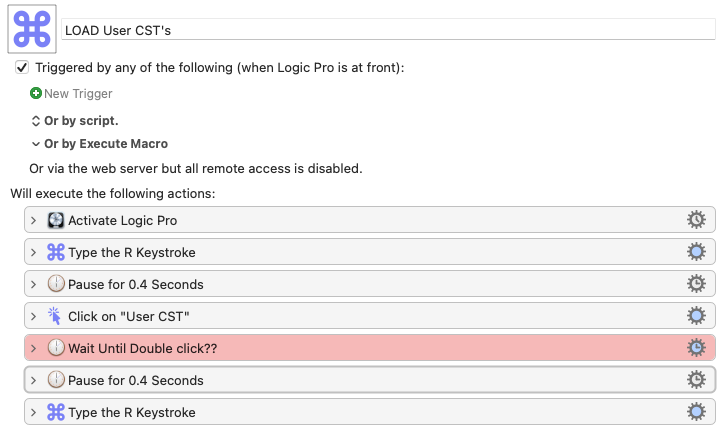 I’ve written a simple Macro to use with Logic Pro, where the library is opened (KM presses ‘R’) then my user library is opened (using a found image) then I navigate to select an instrument to load, and then, after I’ve double-clicked to load that instrument, KM types the 'R' keystroke to close the library. How do I make KM wait until I’ve double-clicked? The red section in my macro. Thanks LOAD User CST's.kmmacros (31.5 KB)
