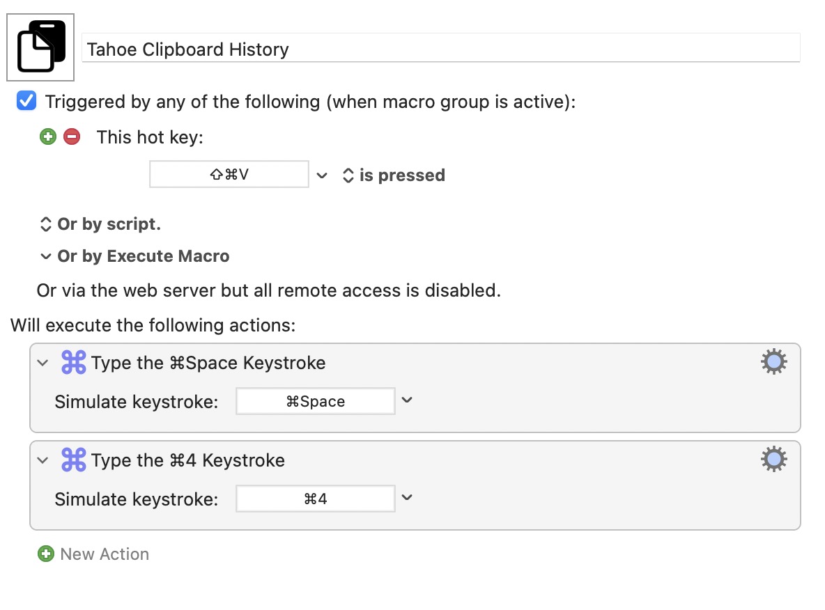 Tahoe has the new inbuilt Mac Clipboard History. But one quirk is that there is no single shortcut to access it... you have to press ⌘space (to invoke Spotlight) followed by ⌘4 to open Clipboard History. Keyboard Maestro to the rescue and my first Tahoe specific Macro ![]()