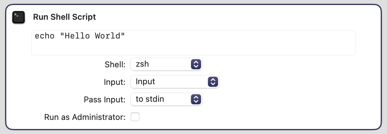 Technically the developer of KM is not the only party which could write an action for macOS 26 Shortcuts. There are probably a few wizards on this site who can write Swift code in Xcode and can follow the advice in that video to create a small action for Shortcuts that will pass data to the KM Engine. In order to help visualize it, here's a captured image of the Run Shell Script action in Shortcuts. A new action to execute a KM macro would look something like this, but would specify the name of the macro, and hopefully have a field to pass data as a parameter to the macro. I don't think the action would require and of the four options we see at the bottom of this image.