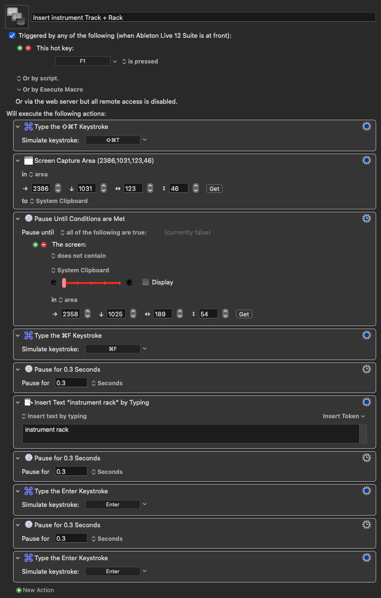 I use keyboard maestro to speed up my workflow on Ableton Live, I would like to press “command + F” then type text “instrument rack” then key stroke “enter” or “return” (don’t know which one would work the best) double times… I have a delay of 0.3 between every action, but everything is acting weirdly: sometimes it works but 1 time every 20… when it is not working the macro stops after typing text, without hitting “enter” double times… I tried to increase the delay time but no change, I tried to change “enter” with “return” no change… I tried to change my macro key from f1 to shift+1 no change… I checked all my permissions and it is all ok…