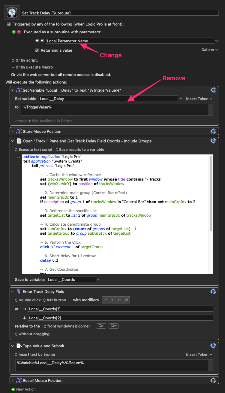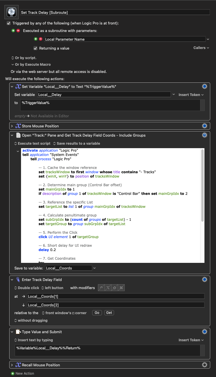 … bouncing back to this version of the macro, at least. I’ve attempted to set this up as a subroute (now having individual macros that trigger each ‘list’ item instead of being prompted). For some reason, though, the variable doesn’t seem to carry through, as when I do the subroute method, the track window opens, and I can see the delay field is clicked, but no value gets inputted.