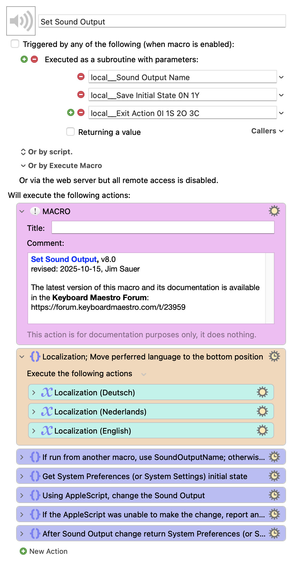 b) Changed to a subroutine with parameters: Sound Output Name, Save Initial State, Exit Action. The macro can still be run by another macro using Execute a Macro specifying the Sound Output Name in the With Parameter field.