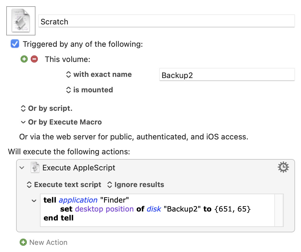 Every time I restart my Mac my Back Up HD is not where I want it on my desktop. I’ve try to create a macro to move it, but no luck. I would like to manually select the HD, then press a keyboard trigger to move it on the desktop. Can someone help with that marco please?