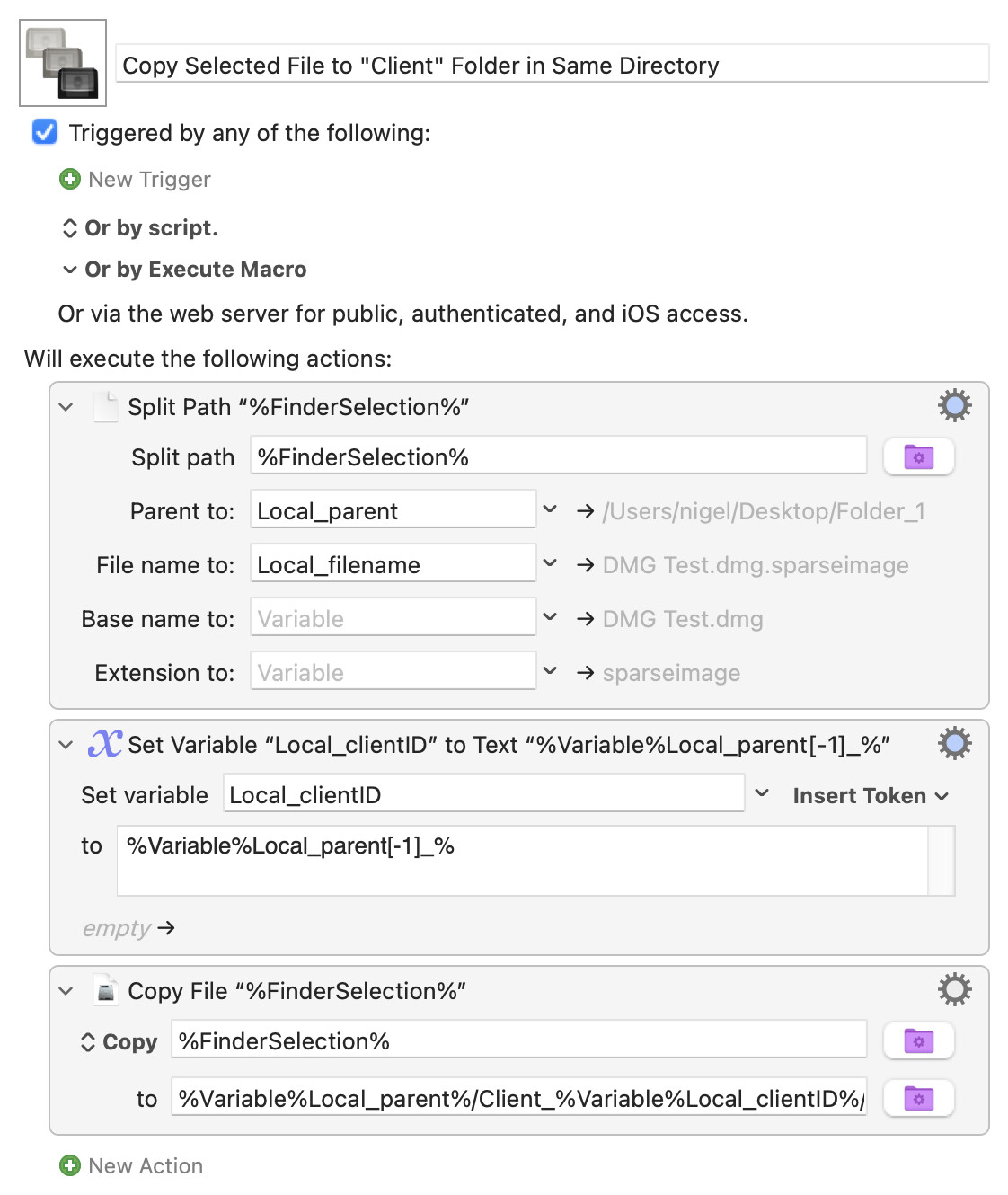 Again, I've taken you literally and copied the file rather than moving it -- that makes the "to" field of the final action more complicated because a "Copy" requires that a file name be included in the destination path (with a "Move" you can miss that out, just referencing the target folder).