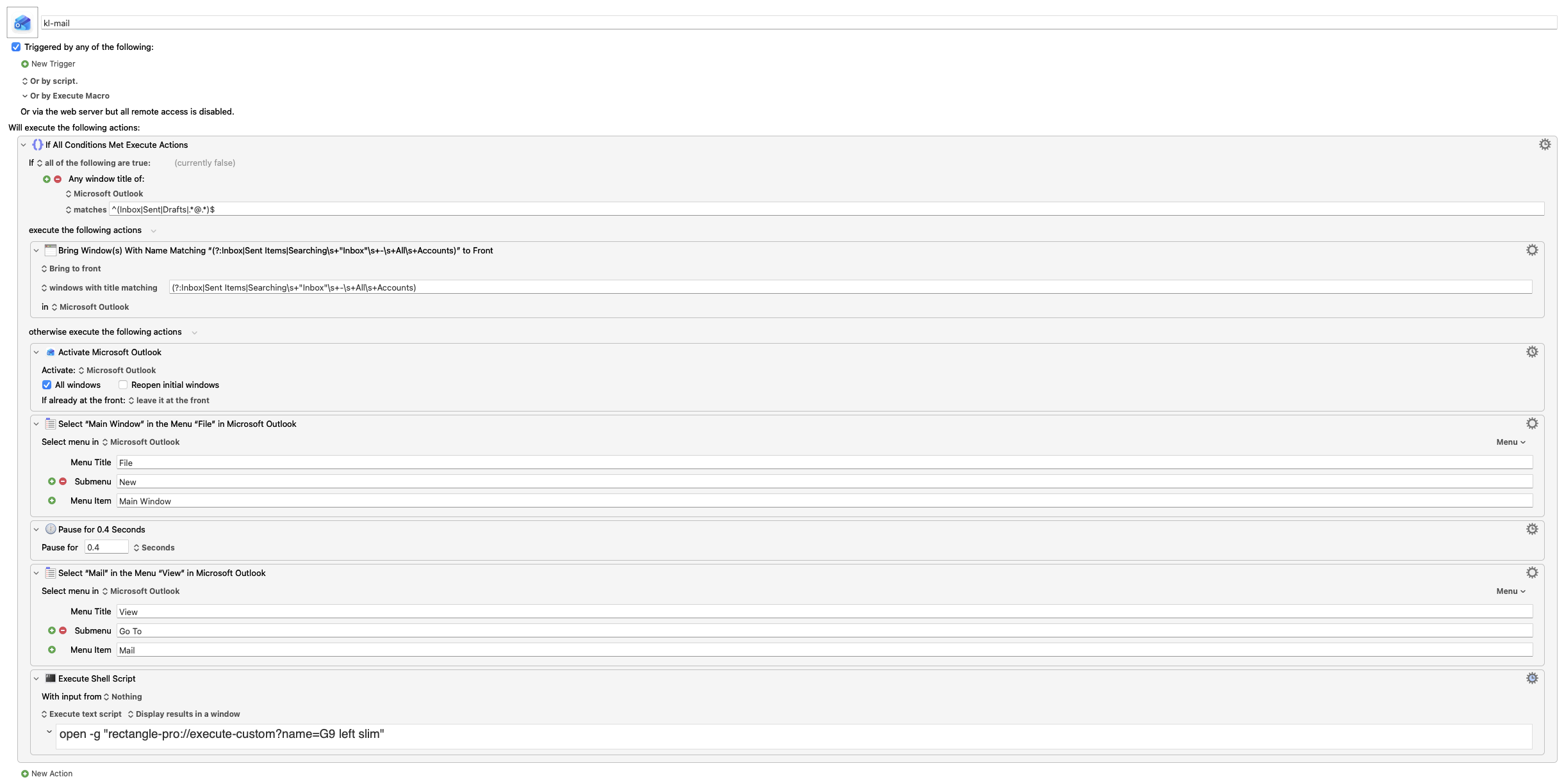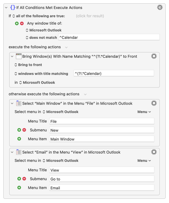 What’s the most reliable way in Keyboard Maestro to detect the existence of at least one Mail-type window in Outlook, while ignoring Calendar windows?