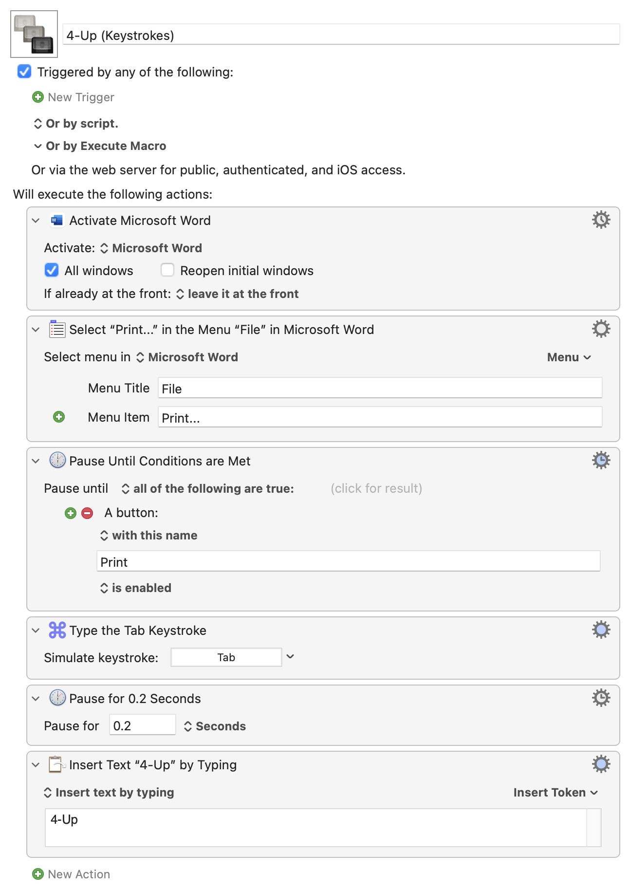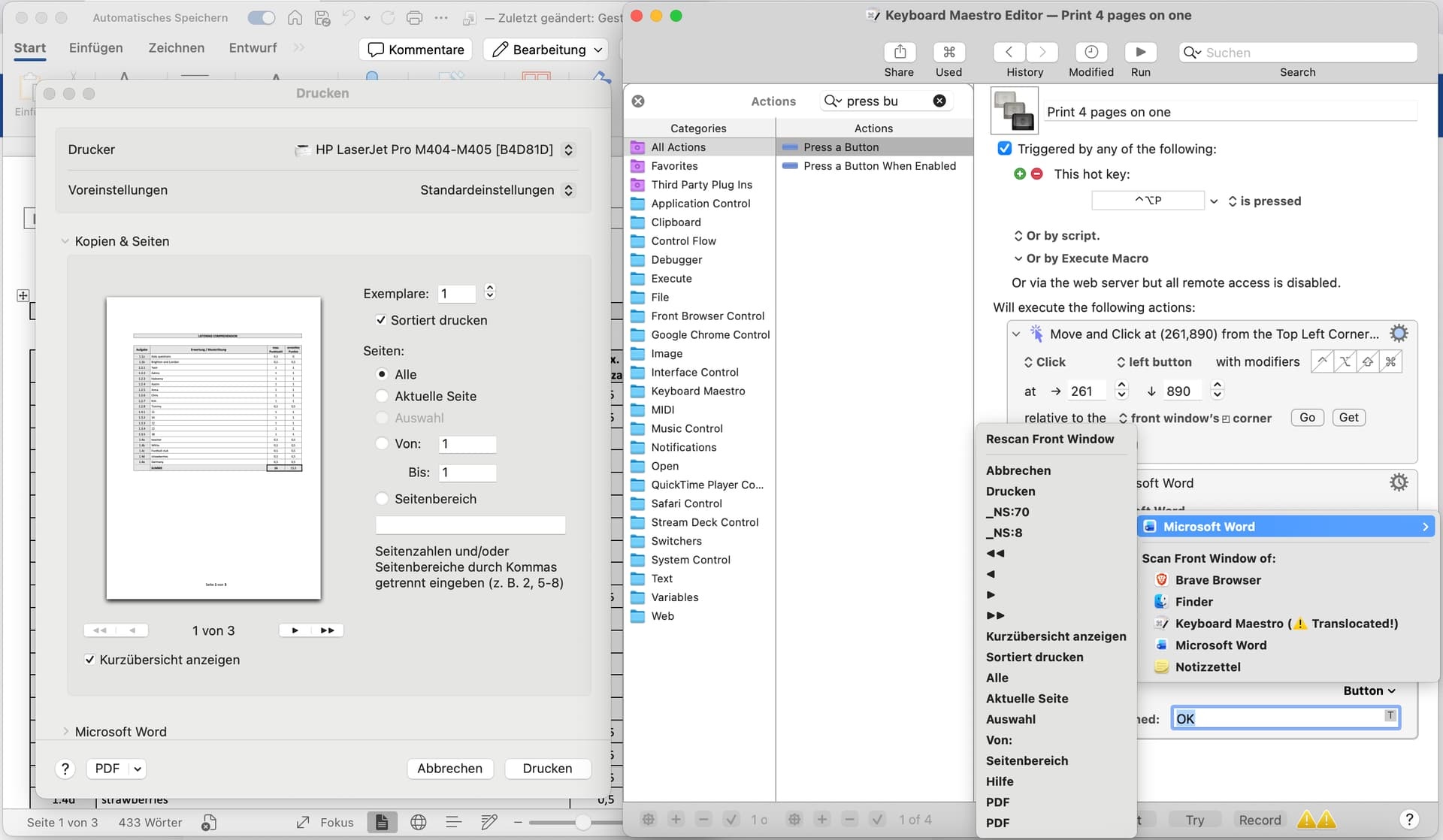 thanks for your thought-provoking comment! Setting the default print settings was easy, and opening MS Word and selecting the print command is also quick and easy. Unfortunately, however, I can't access the preferences menu using a keyboard shortcut, but have to use the mouse instead, which is inconvenient for an action command. Any ideas how to trigger it?