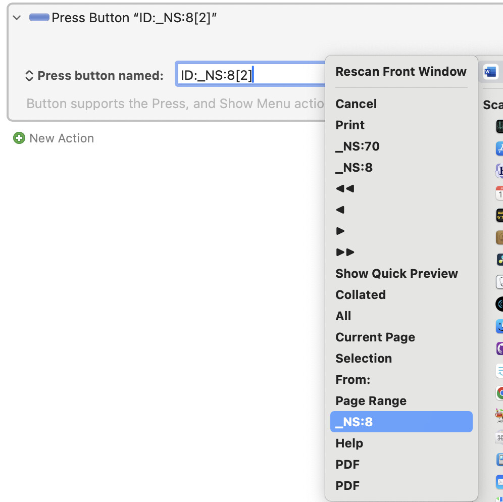 ...and select "Microsoft Word" to scan Word's front window -- the Print dialog -- for buttons. Click the pop-up again and, at the top, you'll now have a sub-menu with all the found buttons -- you can now pick one to click on.