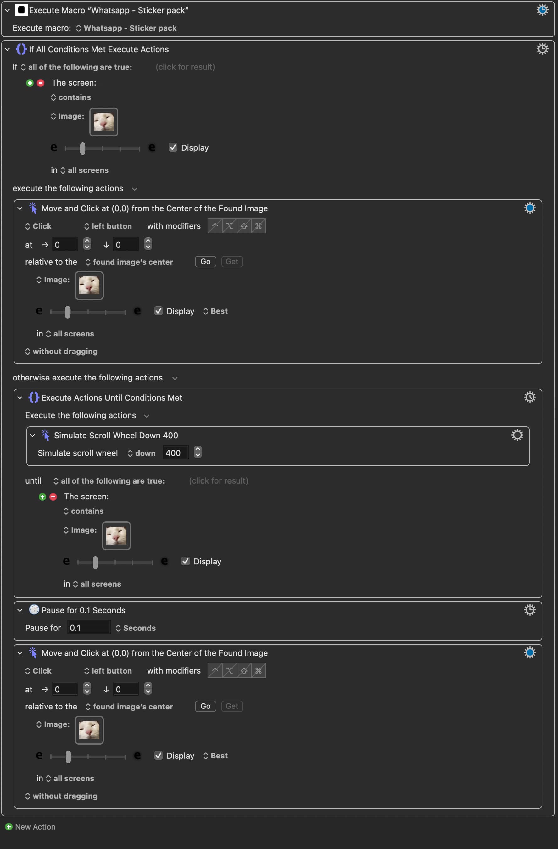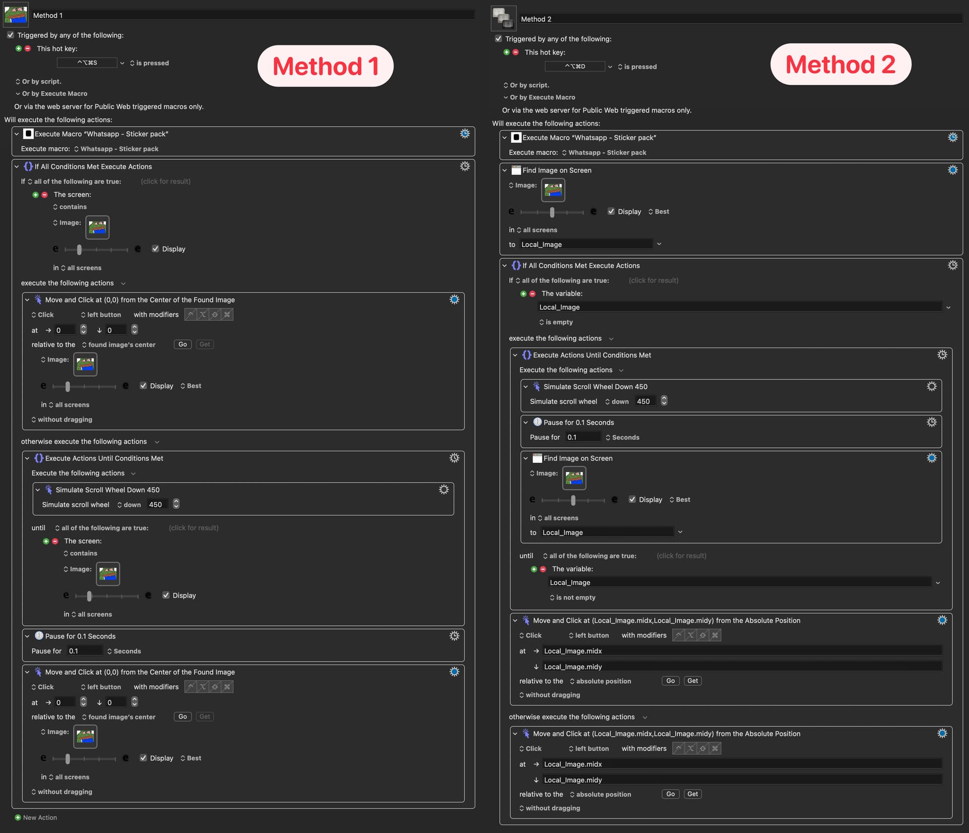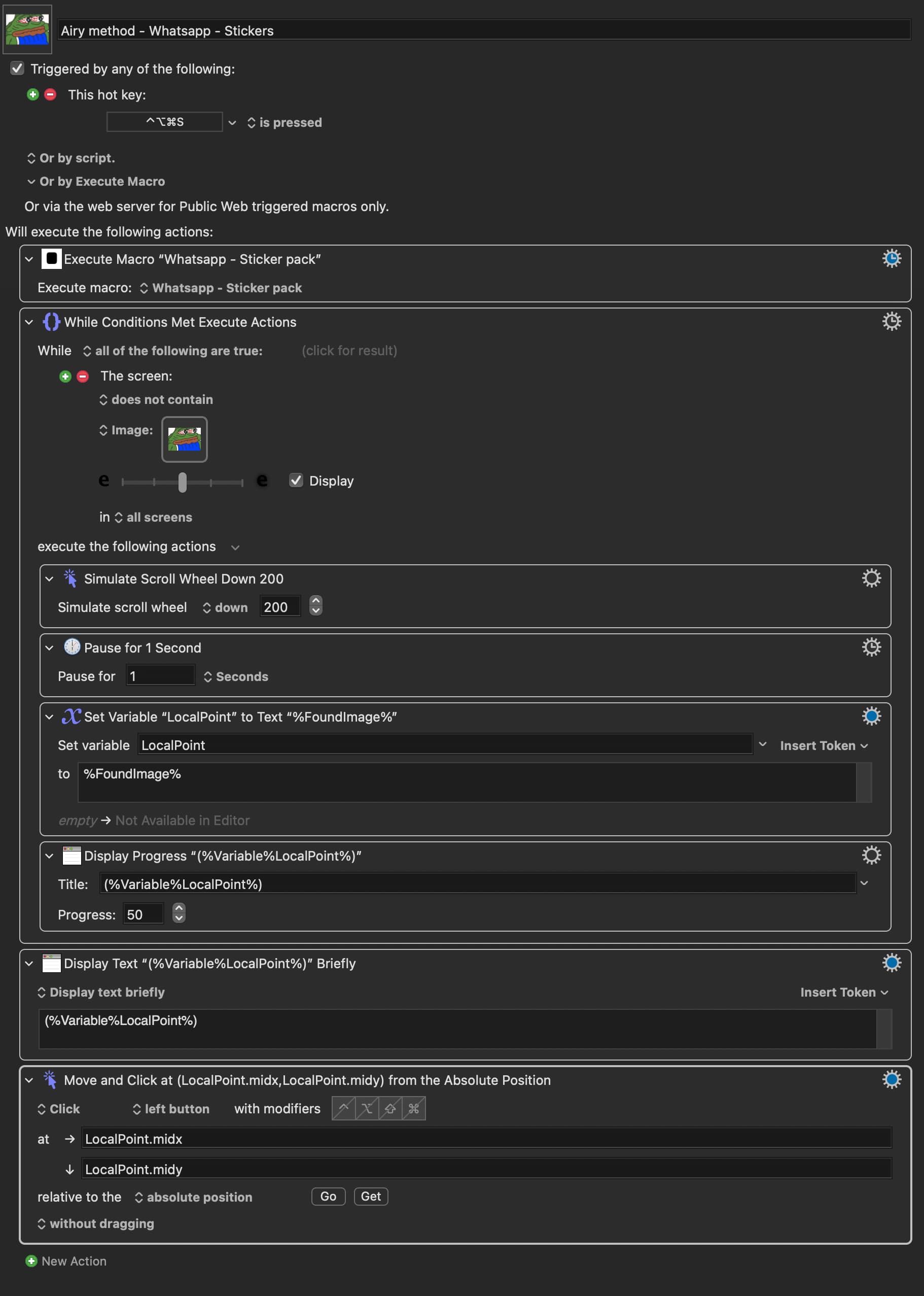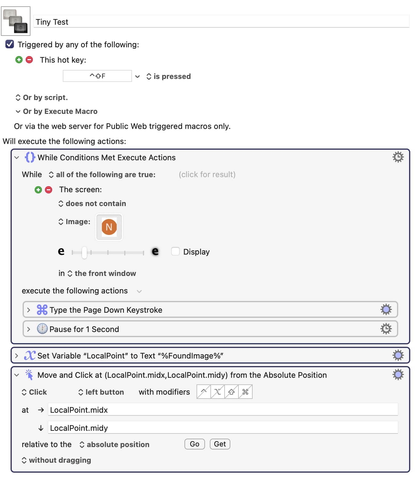 If this works out, I’m going to make over 100+ macros like this, so it’s much easier to just have one found image action like in Airy method (and I only need to change the image and adjust the fuzziness once for each macro if I need to make any modifications)