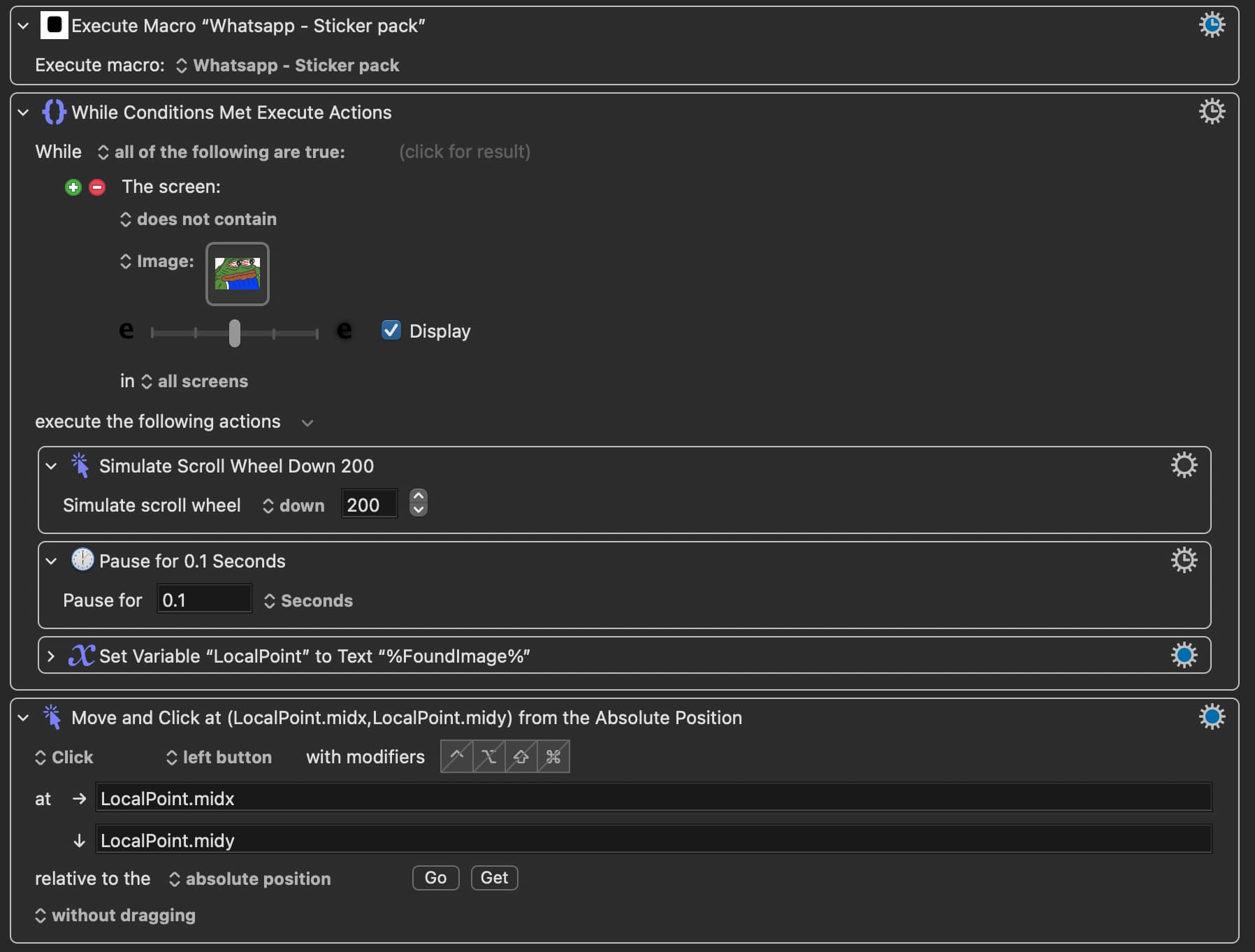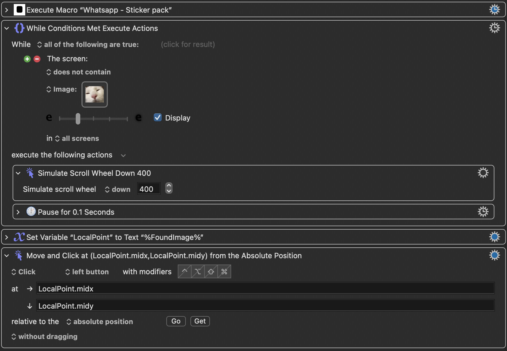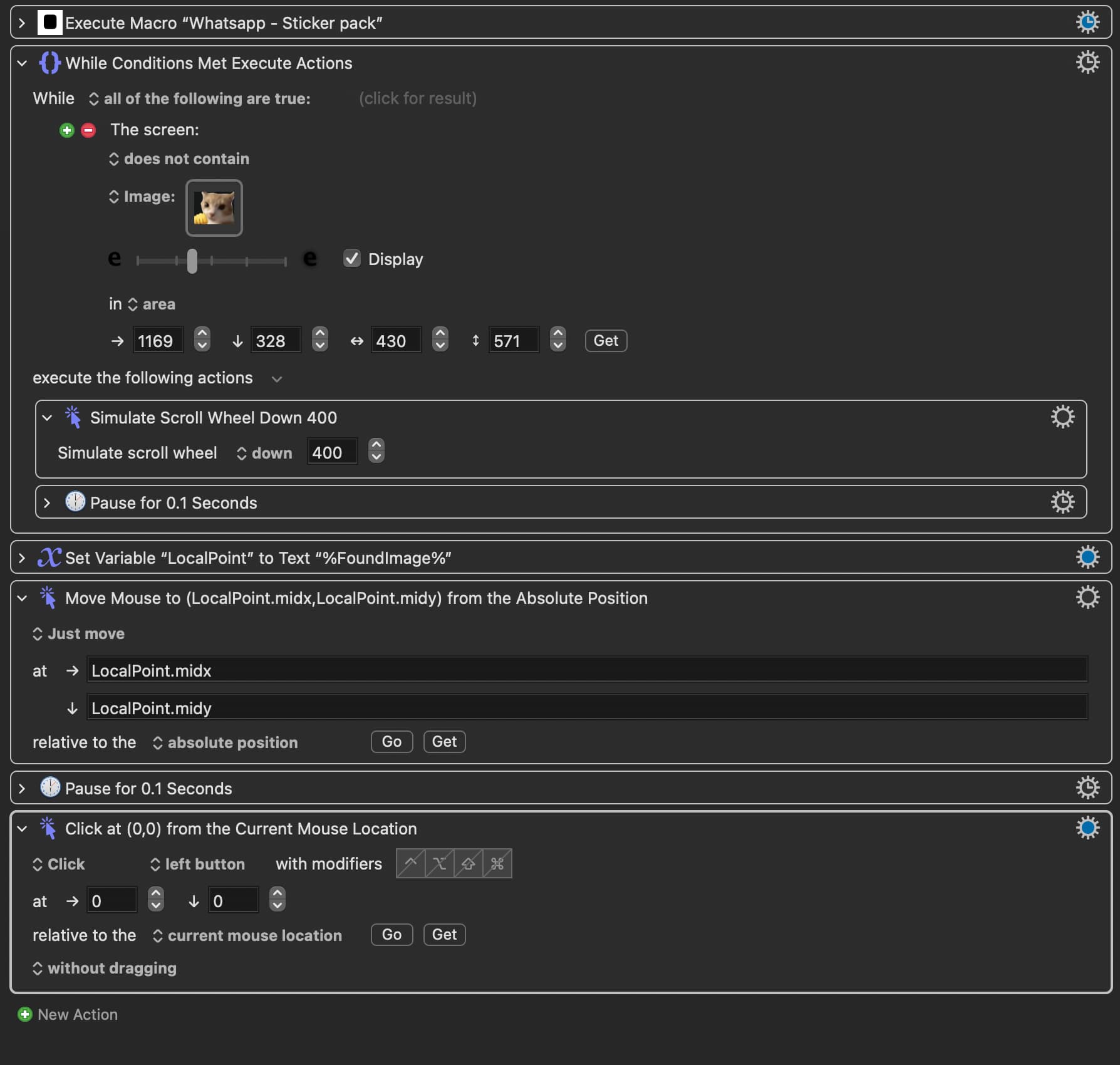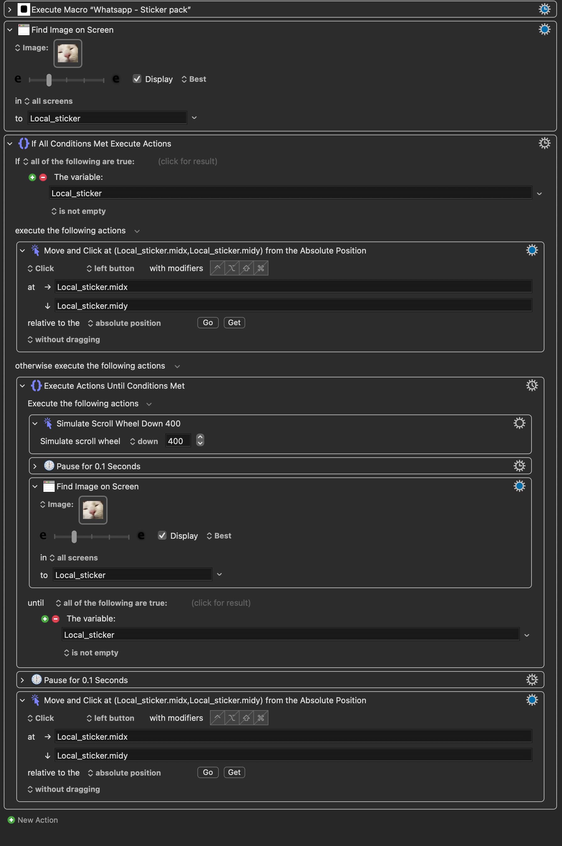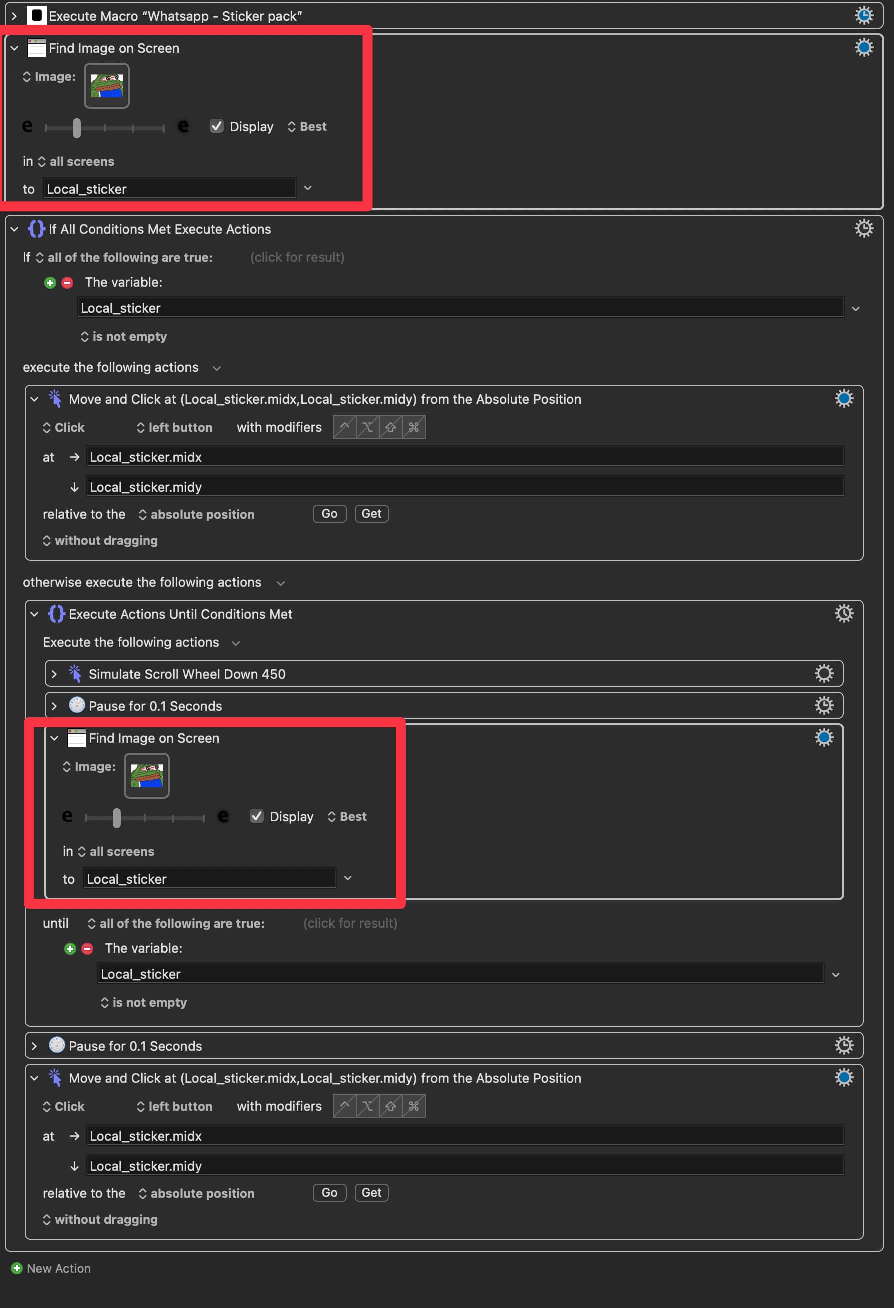 However, I ran dozens of tests with your method and mine. I noticed that when I increased the scrolling speed and/or decreased the time paused in the loop, my method seemed to be significantly more consistent with being able to click on the image, I am not sure how or why. So I’m thinking maybe we could modify this code of mine a little to make it “cleaner”? Specifically, I wonder if it is possible to just use one “Find Image on Screen” action only, so that if I have to change the image or adjust the fuzziness in the future, I only have to do it once, instead of twice like now. (I tried to save “Local_sticker” into a variable, then use the “Use variable“ action later down the code but it doesn’t work (not shown below))