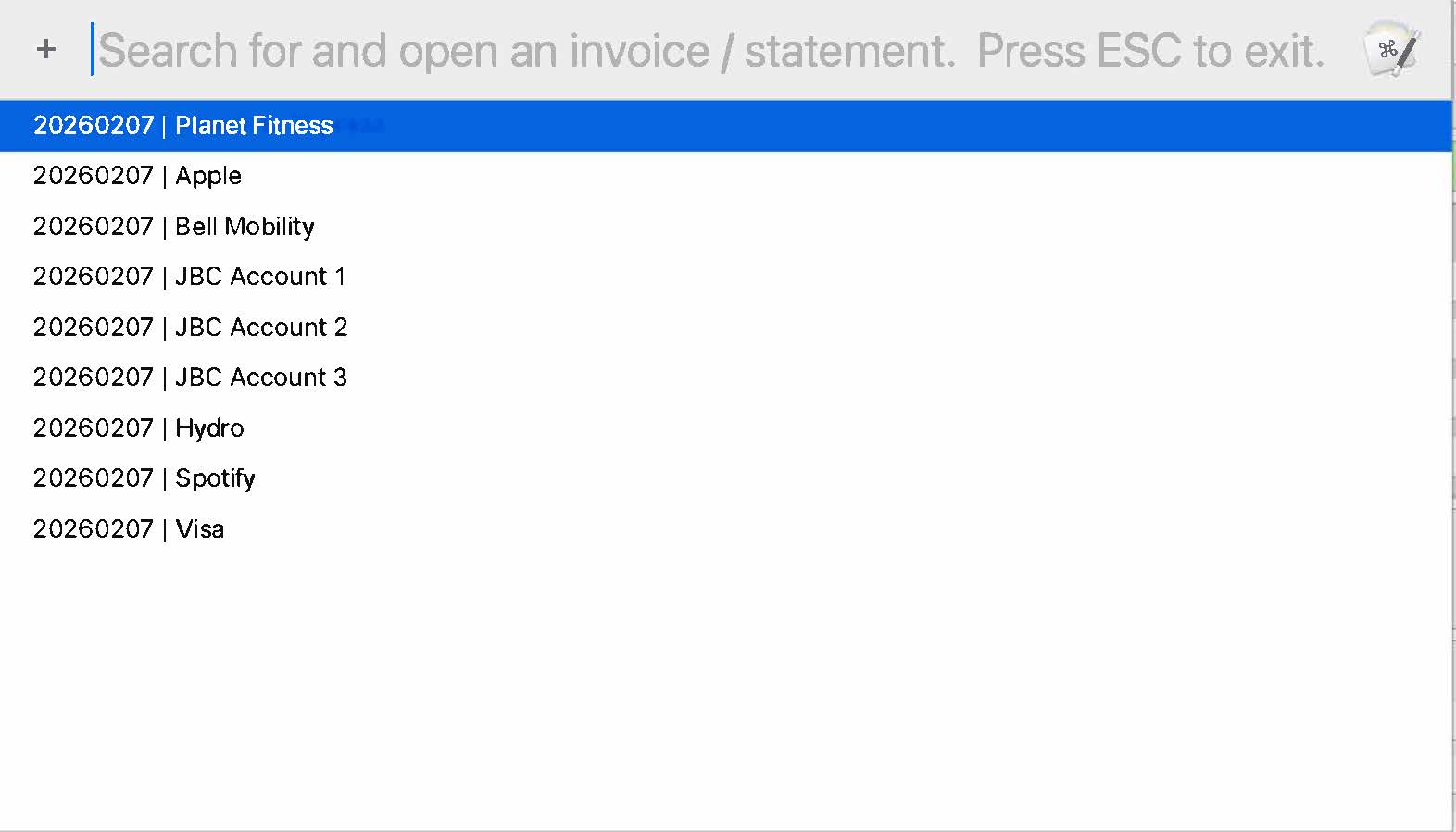 The log will contain a running history so I could search for all Spotify bills and should a particular month be missing (i.e., 202603XX) then the all was not possibly not paid, processed, etc.