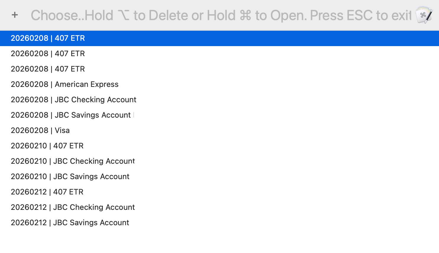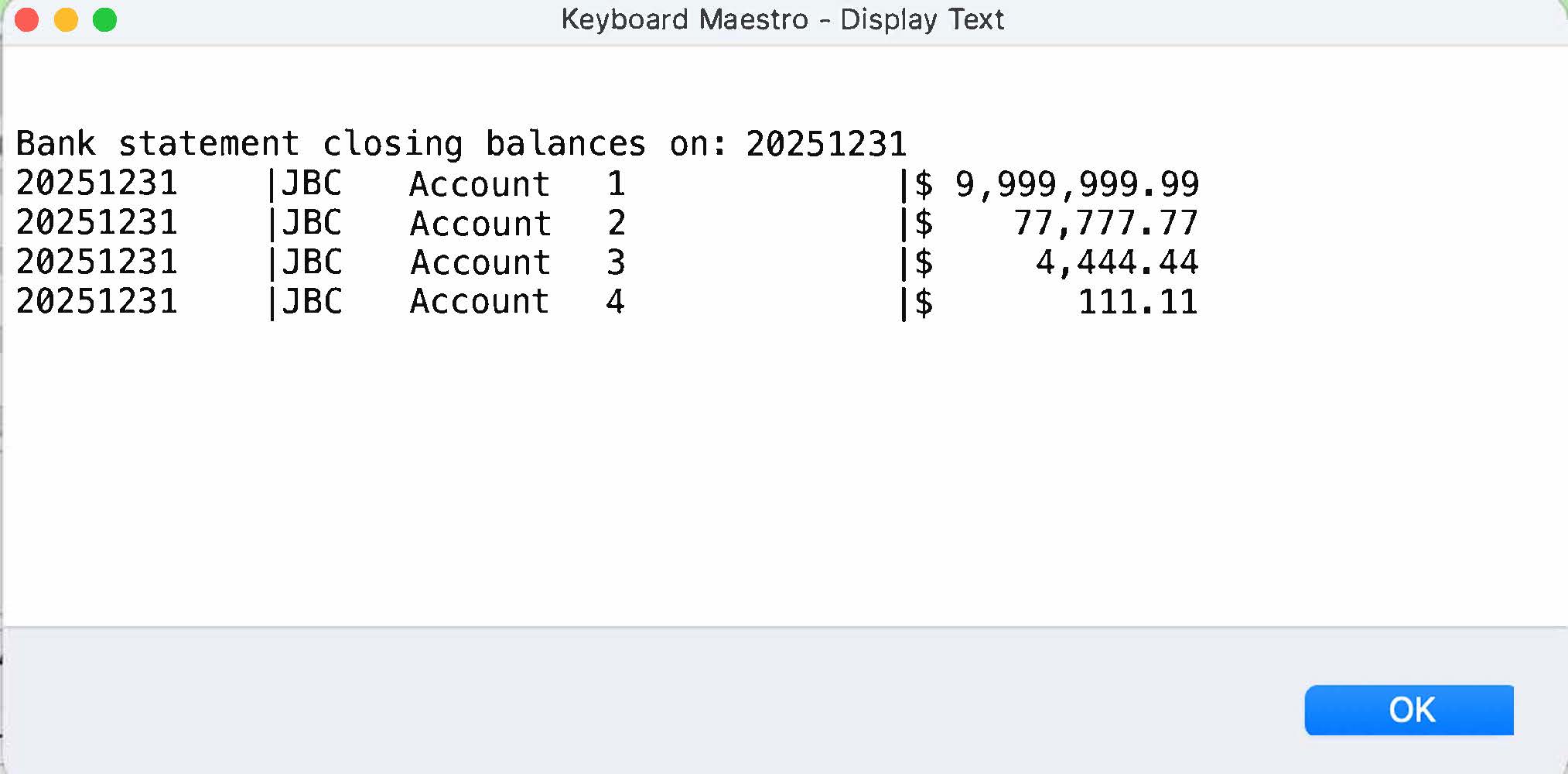 The idea is here is to be able to press a hot key trigger and get the most recent month's closing balances to make it easier to reconcile rather than sifting through multiple files to otherwise get / write down the balances. The window looks like this: