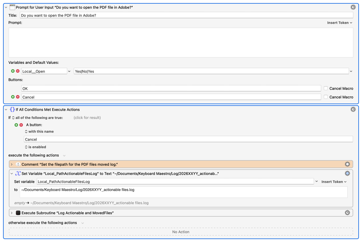 The idea is that when the last action in the macro prompts the user to open the downloaded the file and the user responds with the CANCEL button or NO that the file is added to the process log.