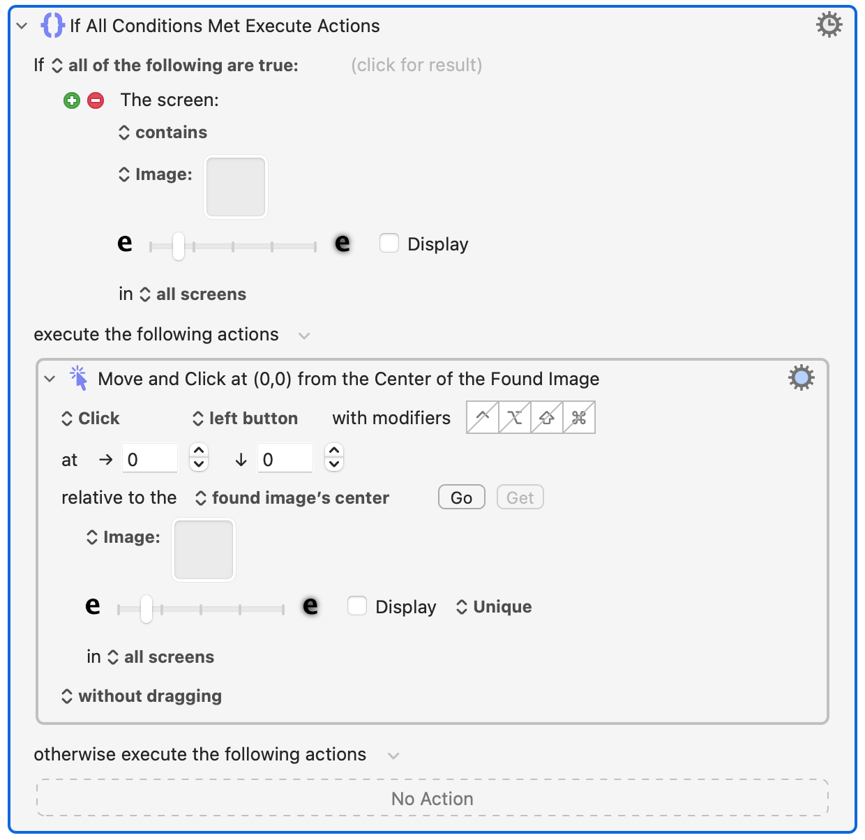 Here I embedded the Action of clicking on the image as a criteria of an If-statement in order to be able to handle possible error states, if the expected object doesn't appear on the screen for some reason.
