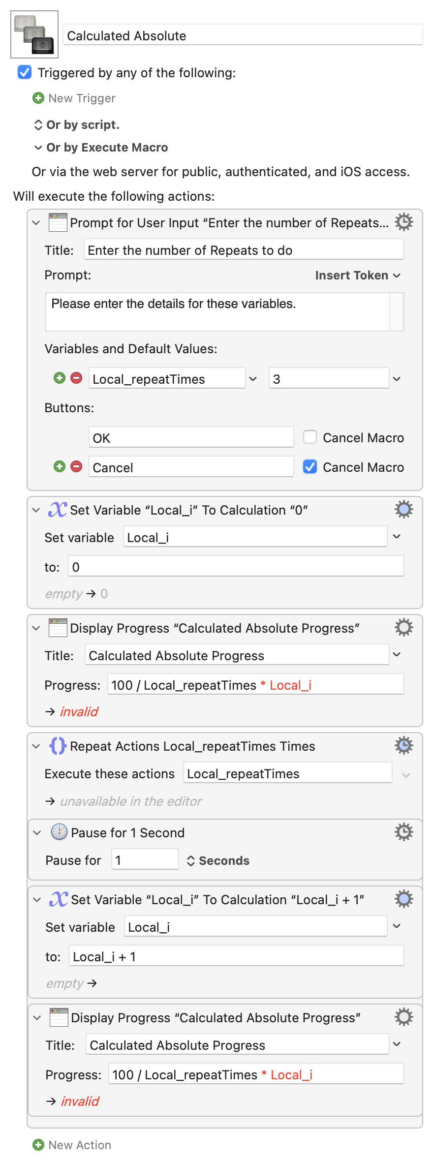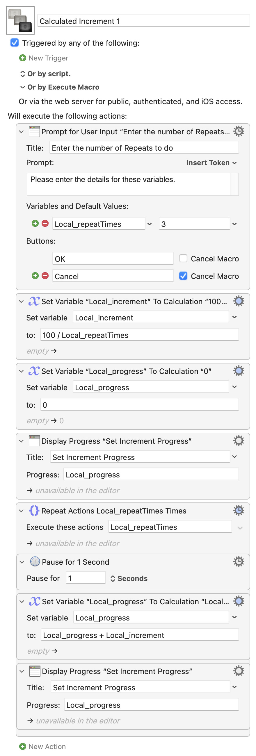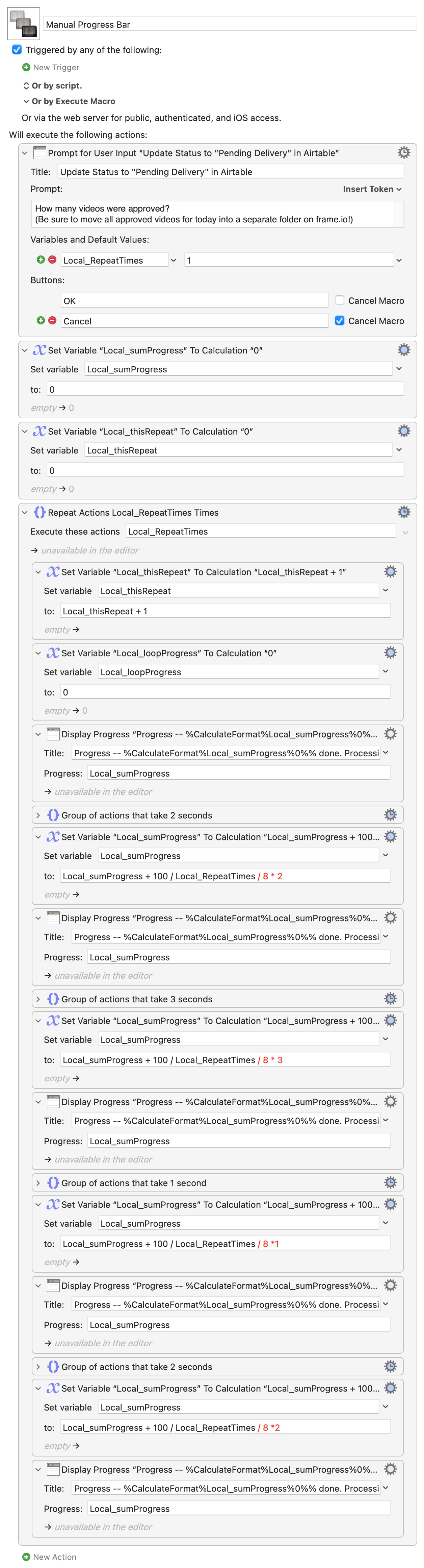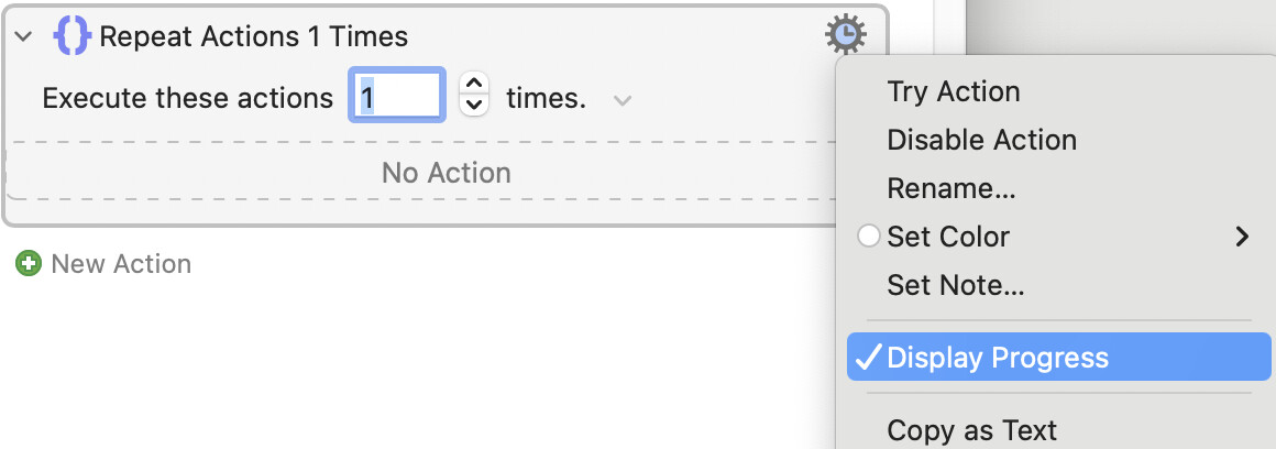 So the upsides of the "Display Progress" action are that you can display a progress dialog whenever you want, set to whatever you want, with a title determined at runtime. The downside, compared to the "automatic" version, is that you have to add the action and supply the information! And that's where a knowledge of KM's Tokens, Variables, Calculations (and maybe Functions) comes in.