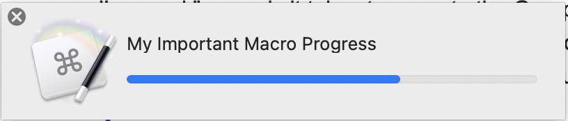 Notice that when "Progress" is set to 100 the dialog closes. And it doesn't close until progress has been set to 100, even if the macro has finished -- disable the last action of the above macro to see that. (The user can still close the dialog manually, of course.)