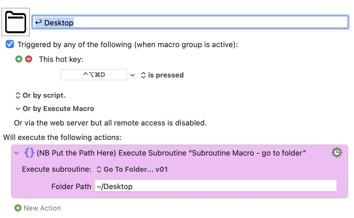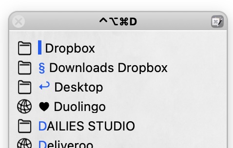 To go to the folder or website I want I either click it in the Palette or type the blue highlighted letter. That first blue symbol at the head of the Dropbox Macro, is actually just a "space" that is the first letter in the Macro's name. Hitting the spacebar while this palette is up takes me to my Dropbox folder. Likewise the Return symbol is the first letter in the Desktop Macro's name. Hitting Return while this palette is showing, takes me to my Desktop.