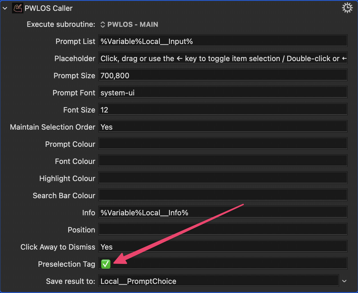 You can copy and paste the modified code above into the Custom “HTML List Prompt” action within the “PWLOS - MAIN” macro, or simply download the complete macro group