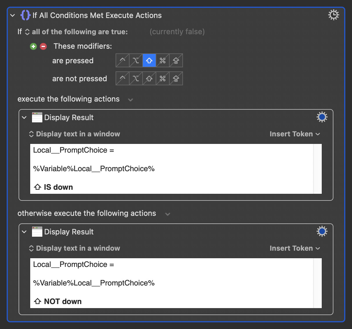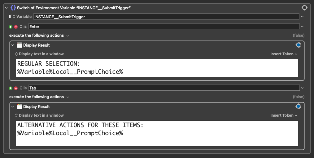 Pressing Tab now submits the form and passes "Tab" to the INSTANCE__SubmitTrigger variable. This allows for flow control (e.g., routing to a specific "Switch", "Prompt for User Input" or "Prompt with List", like Alfred's Universal Actions), to perform different actions on the selected items.
