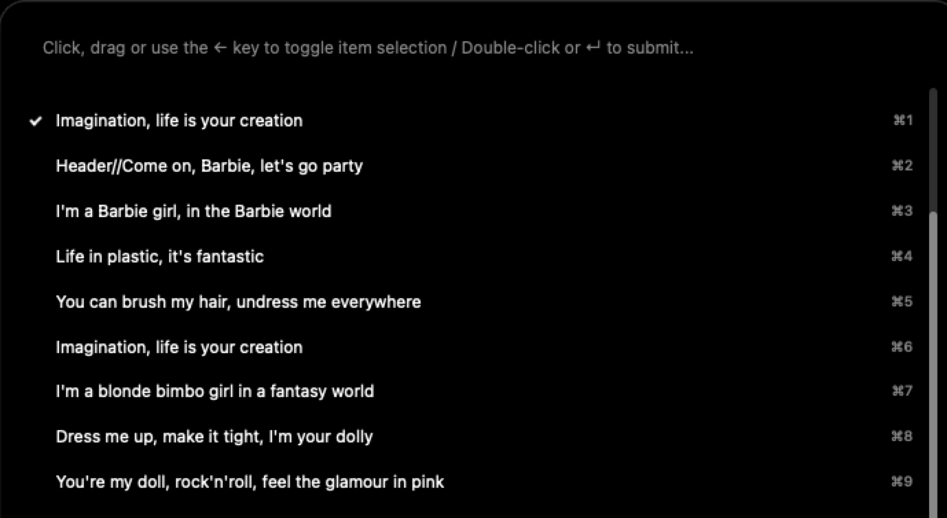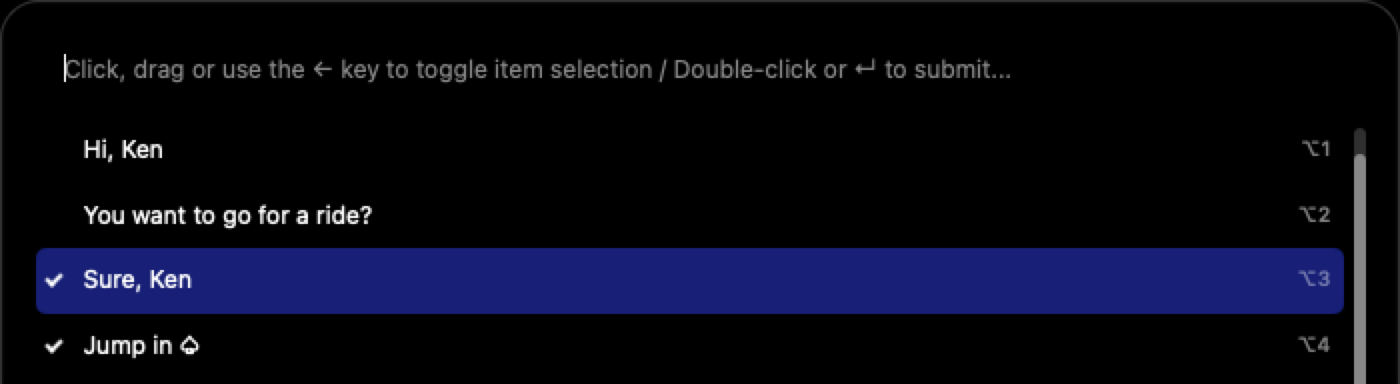 My goal was to replicate some of Alfred features. I love being able to select items directly using ⌘ + Number, and toggle the selection with ⌥ + Number. I also wanted a specific key (Tab) to control the workflow after selection.