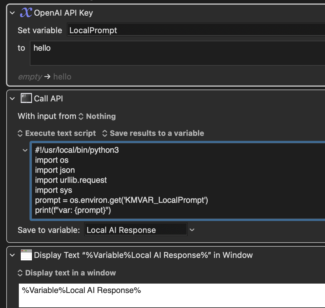 The second thing is to show us how you spawned that python code. Did you run it from an action inside the same macro where the local variable was created? My guess is that this is your problem.