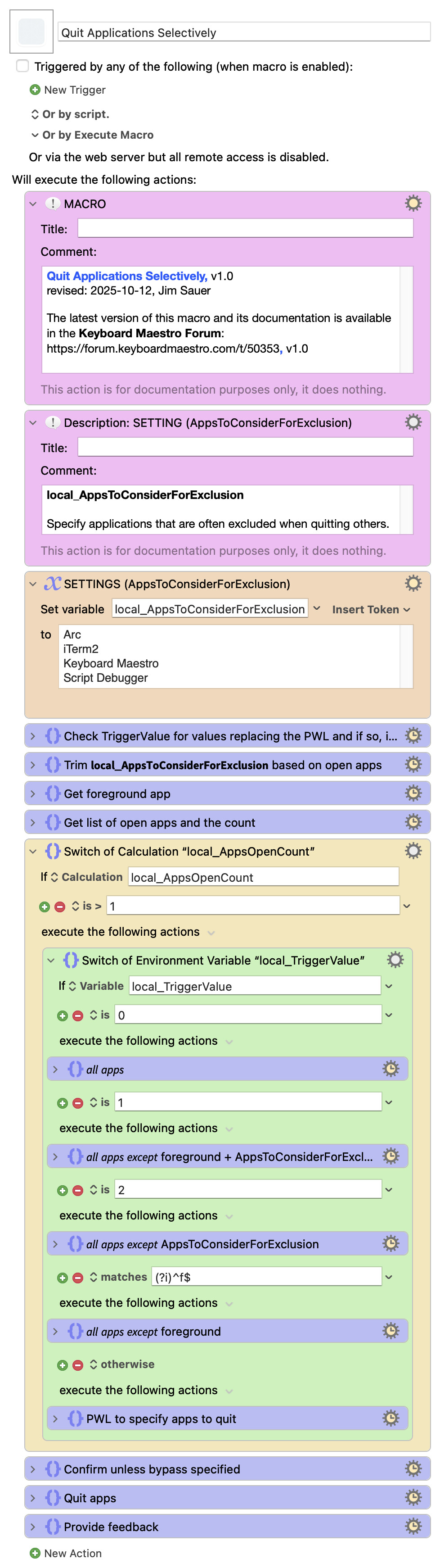 This macro, Quit Applications Selectively, can be used to quickly close all, or a subset of all, open macOS applications.