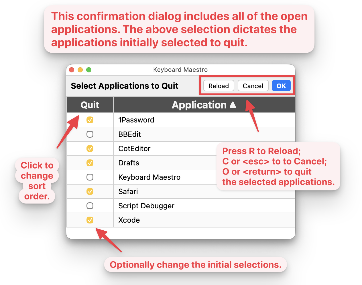 This dialog can also be displayed by triggering Quit Applications Selectively from the Keyboard Maestro editor with the command key (⌘) held down.