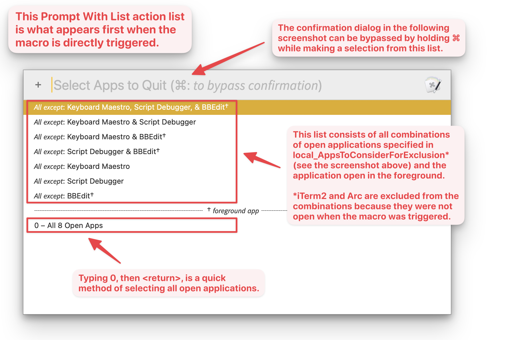 In addition, you can start Quit Applications Selectively, but exclude the foreground application from the initial Prompt With List.
