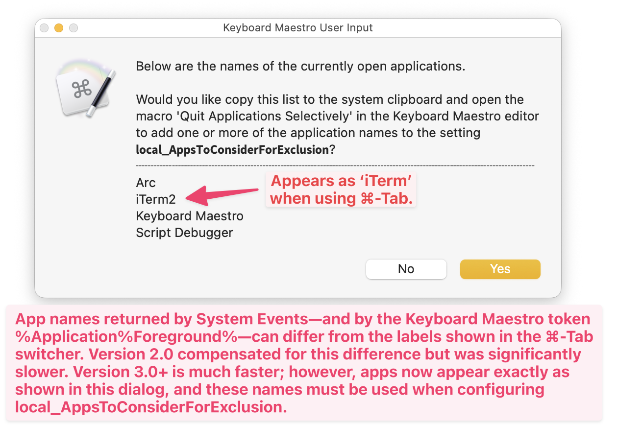 a) The macro now uses app bundle IDs and process names. Thus edge cases like iTerm (which use custom display names) and Setapp-distributed apps (which use modified bundle identifiers) are easier to detect and quit. The result: the local_AppsToConsiderForExclusion allows and dialogs display the familiar names seen in Cmd-Tab for both standard and non-standard apps.